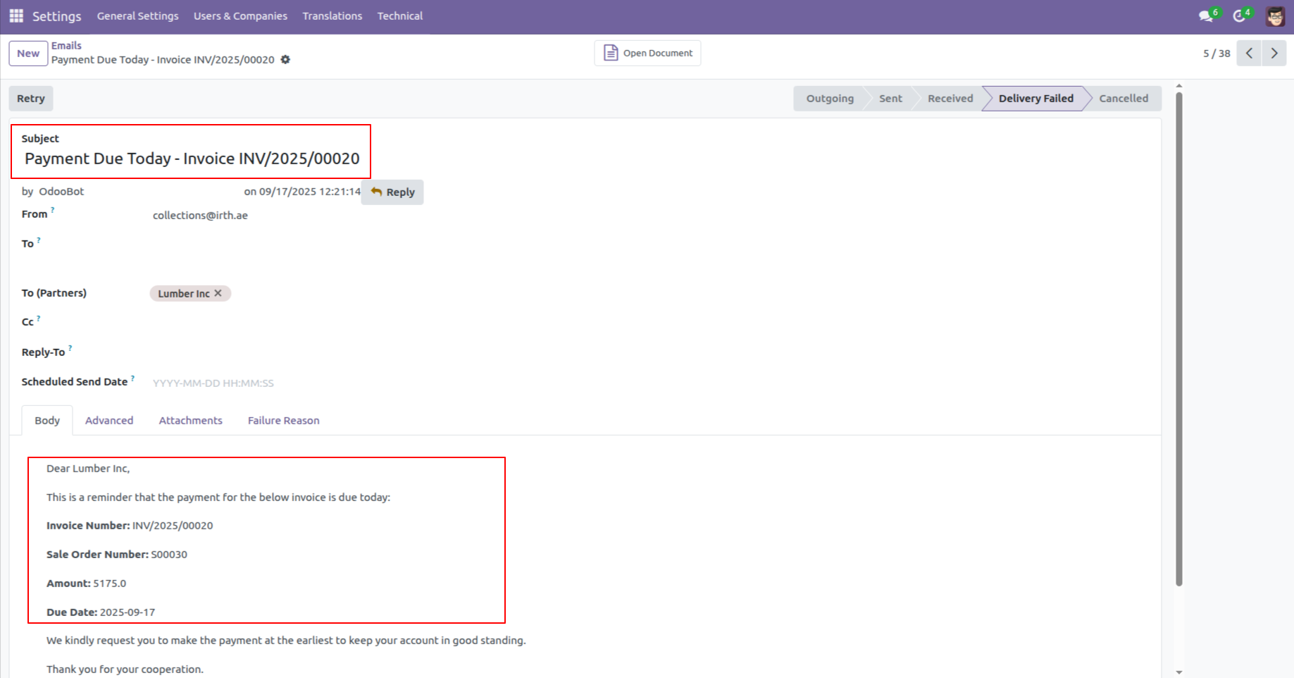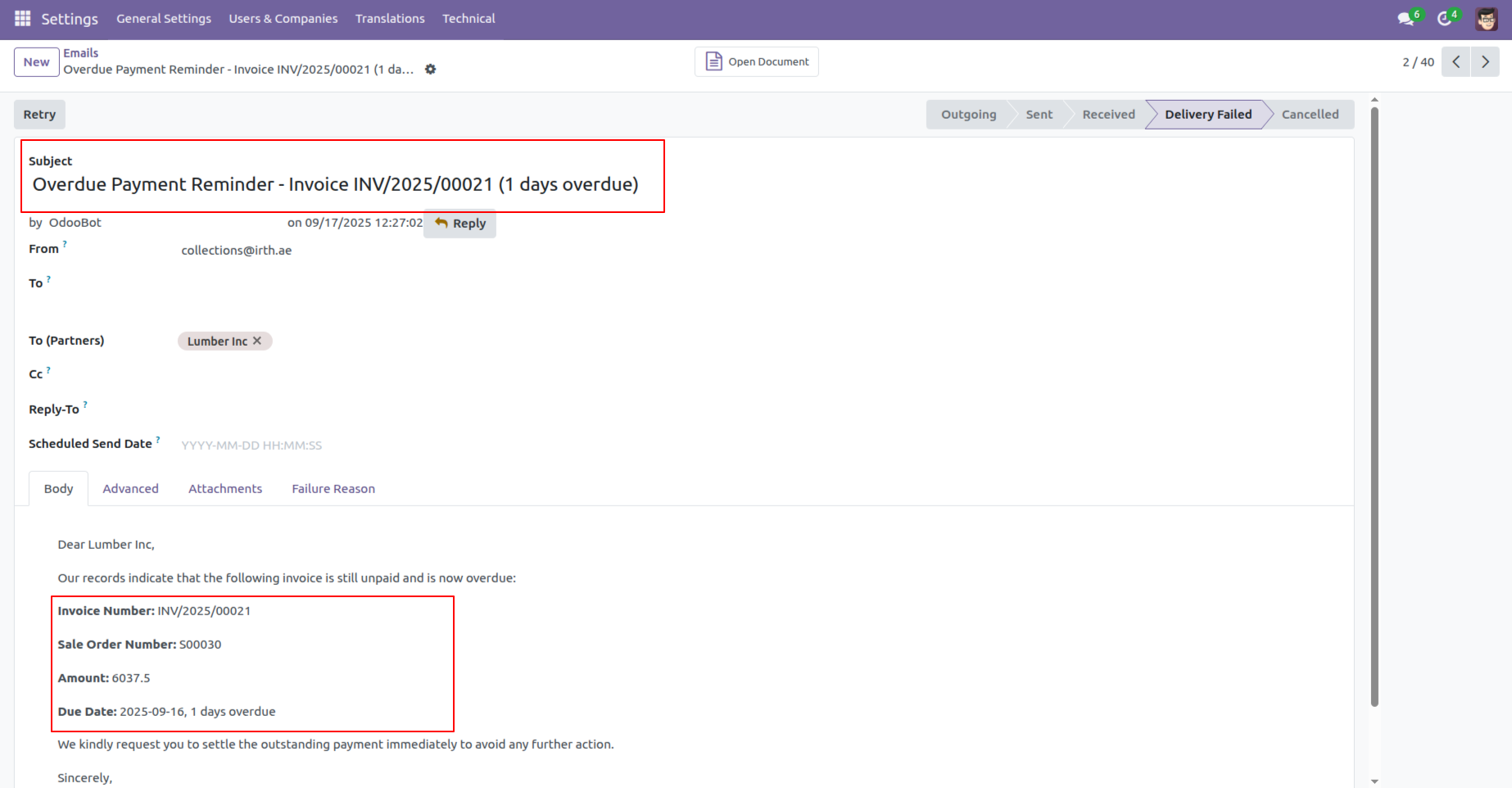 Send email to customers after the invoice due date to follow up on overdue payments.