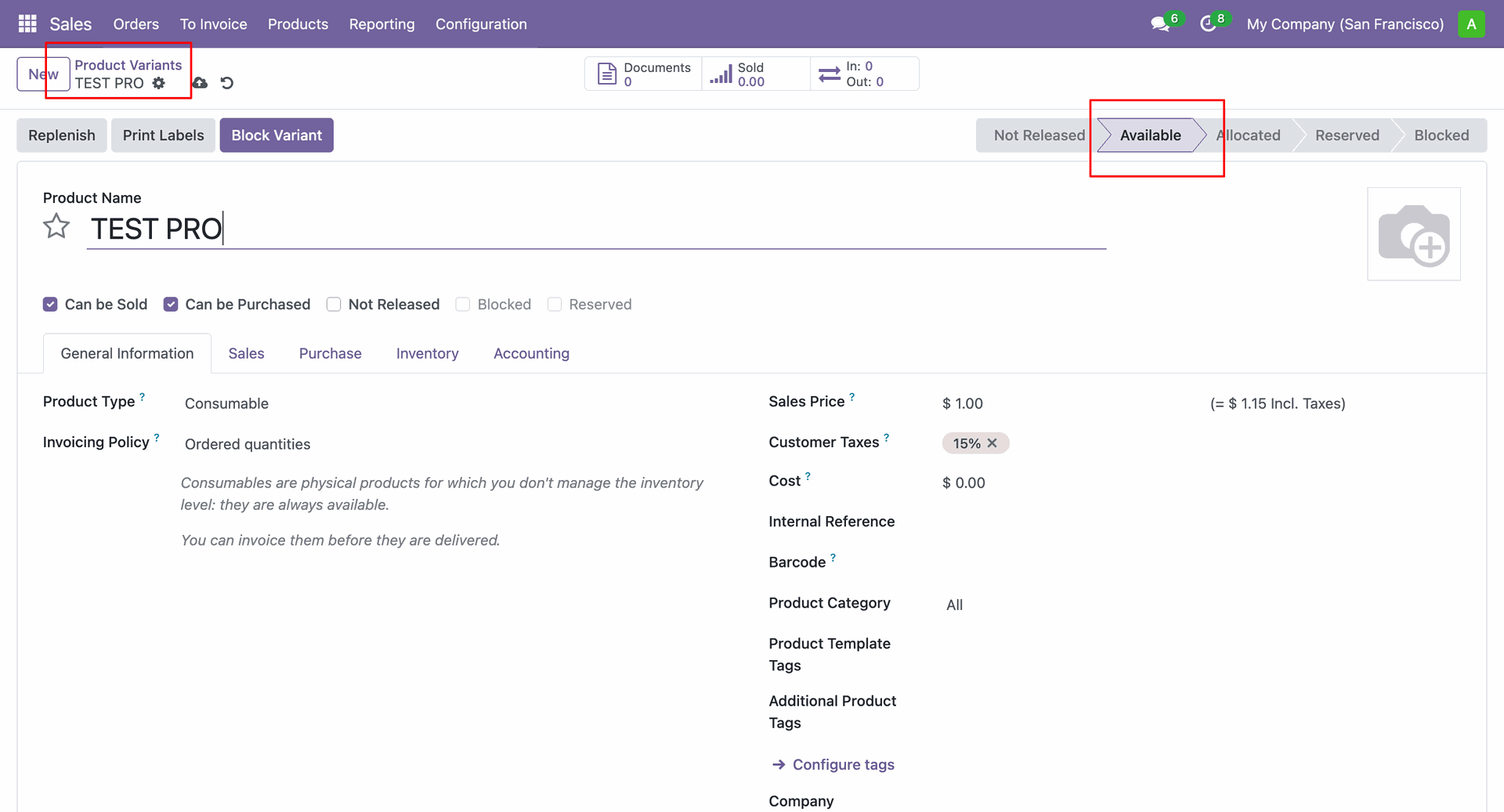 Here you can see that the "TEST PRO" product variant is in the "Available" stage.