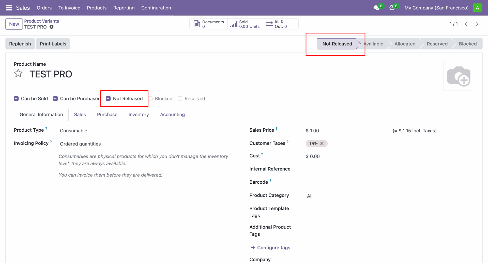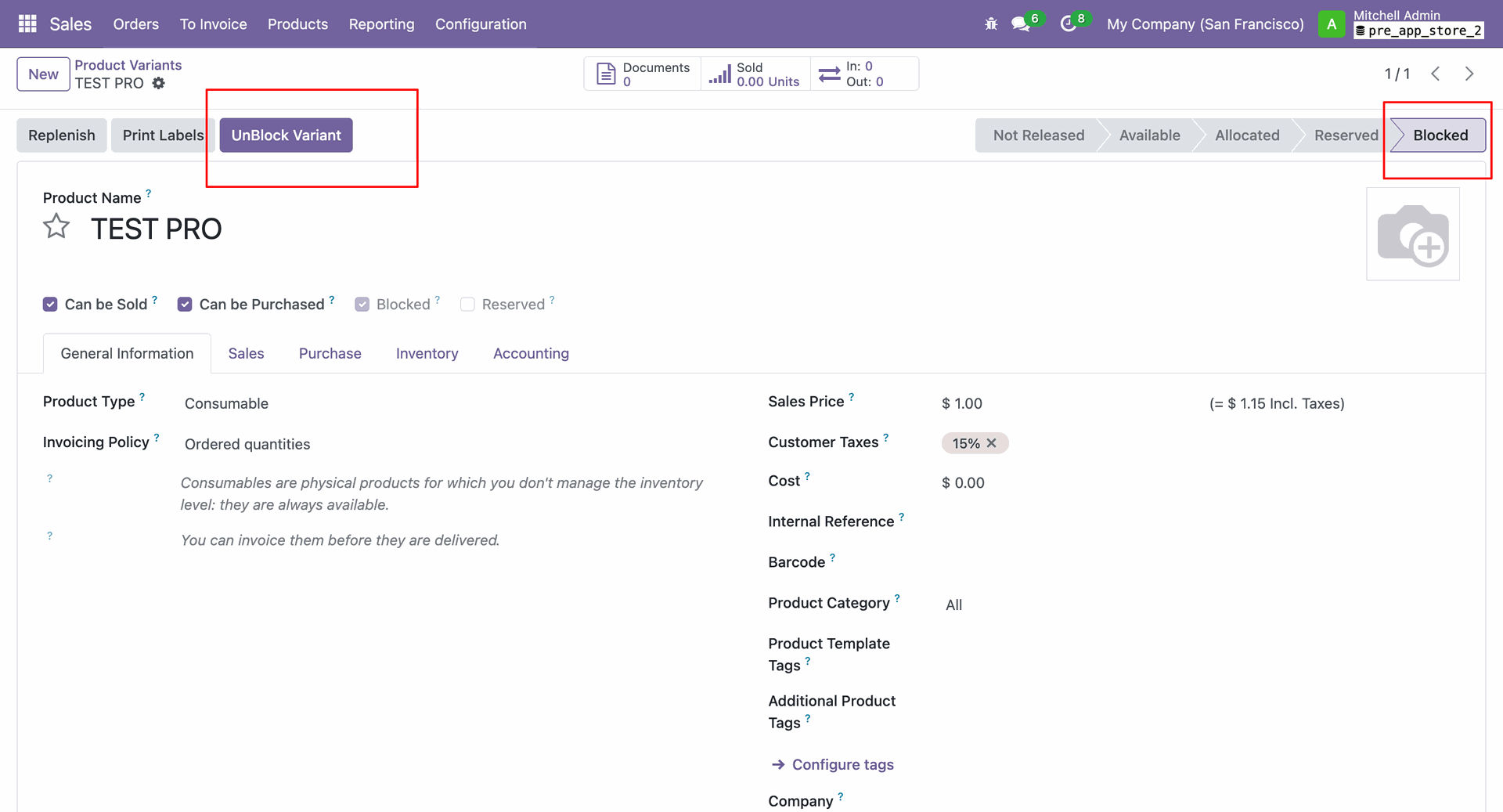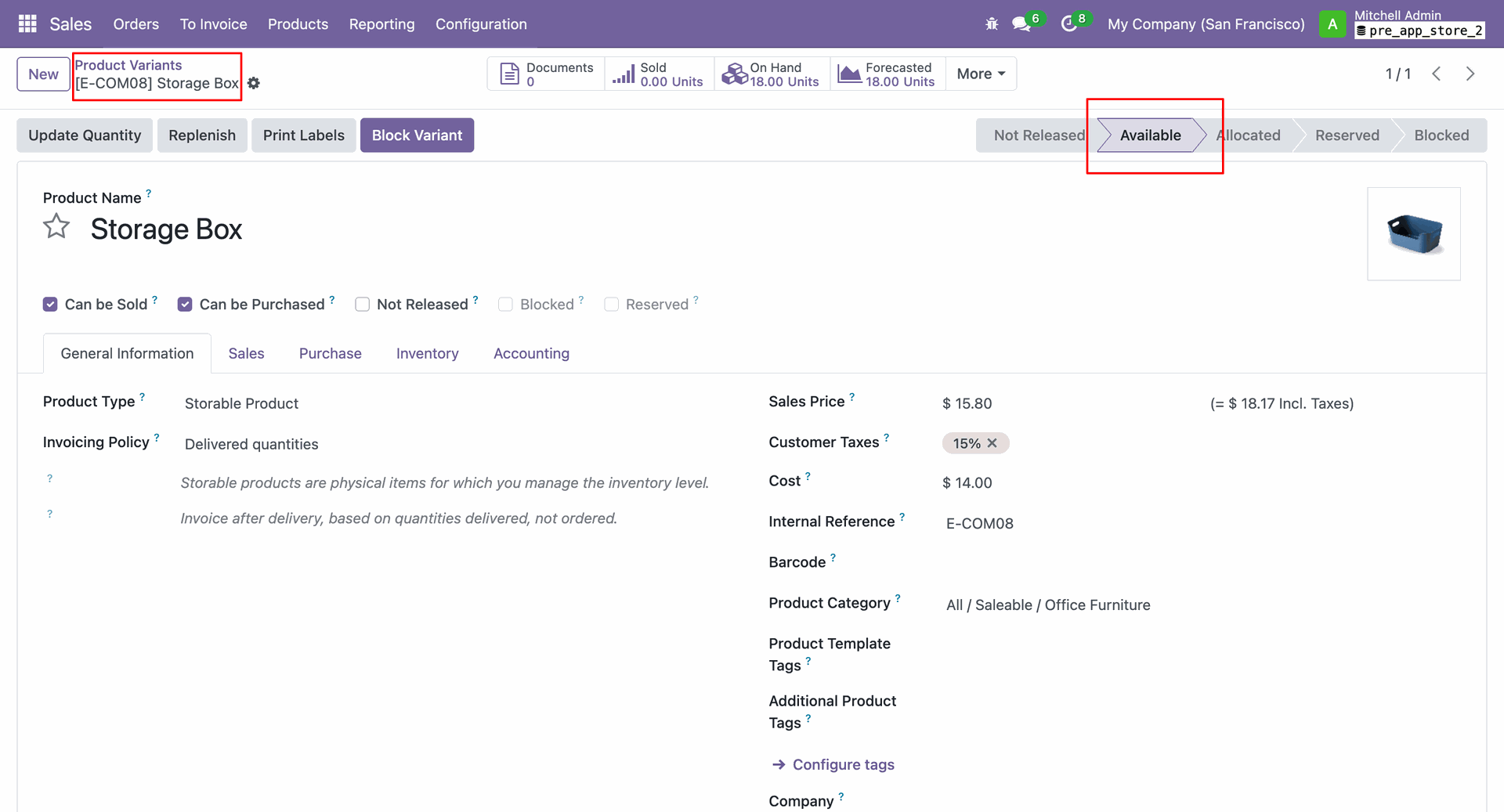 In the product variant form view, you can see that the variant is currently in the “Allocated” stage.