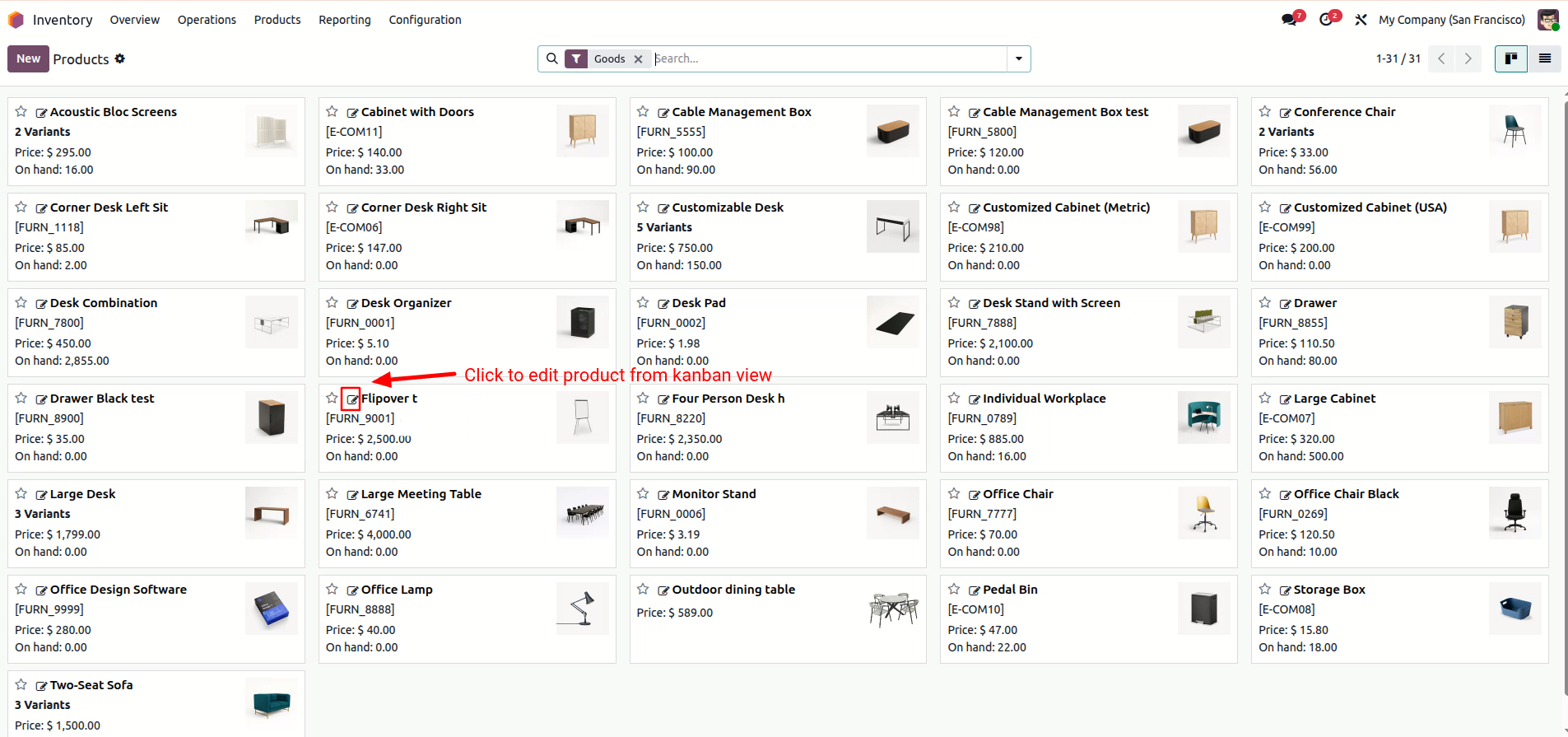 Adds an "Edit" button (pencil icon) to each product card in the Kanban view, allowing for quick access.