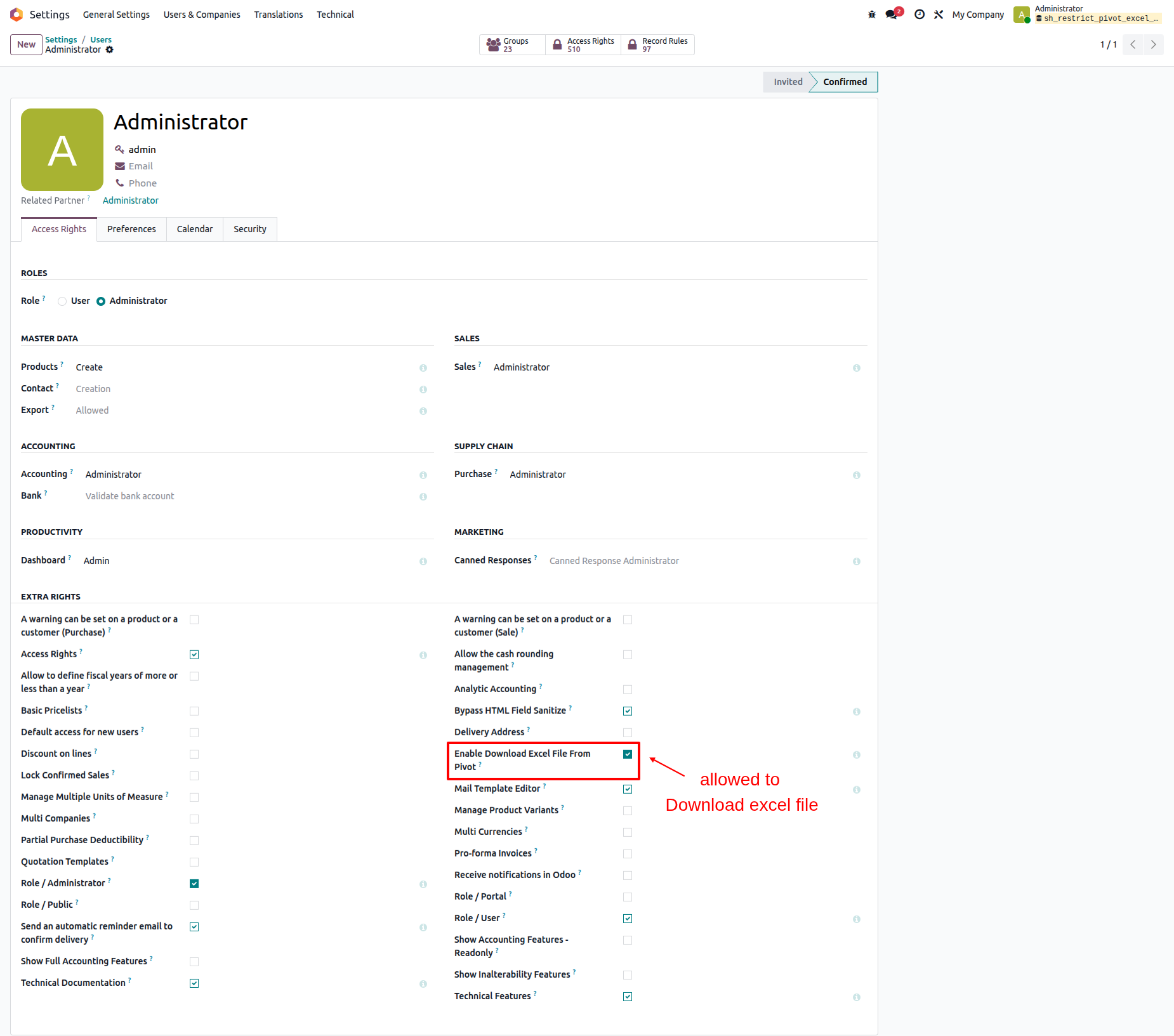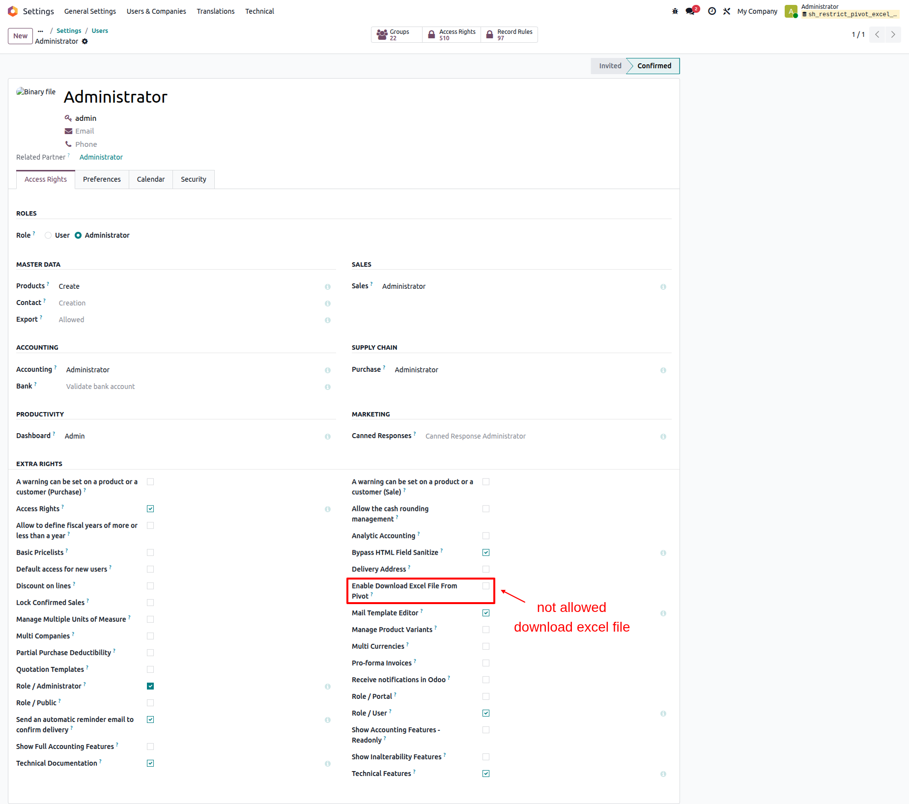 Restrict Excel file downloads from Pivot View across all Odoo applications.