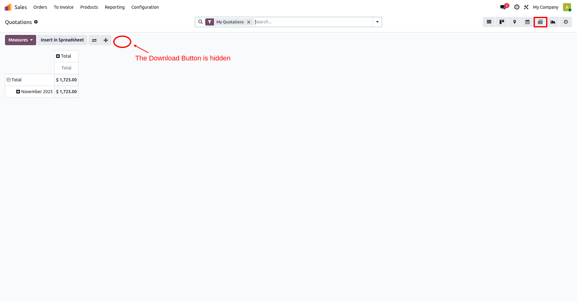 The Download button is not visible in the pivot view of the Request for Quotation.