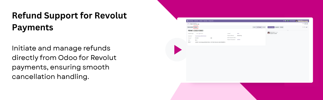 Process refunds directly from Odoo for any order paid through Revolut. Ensuring smooth handling of cancellations.