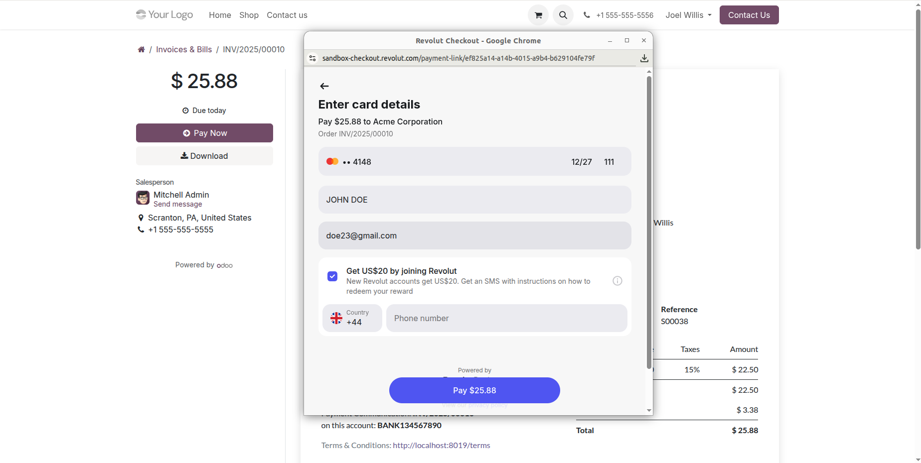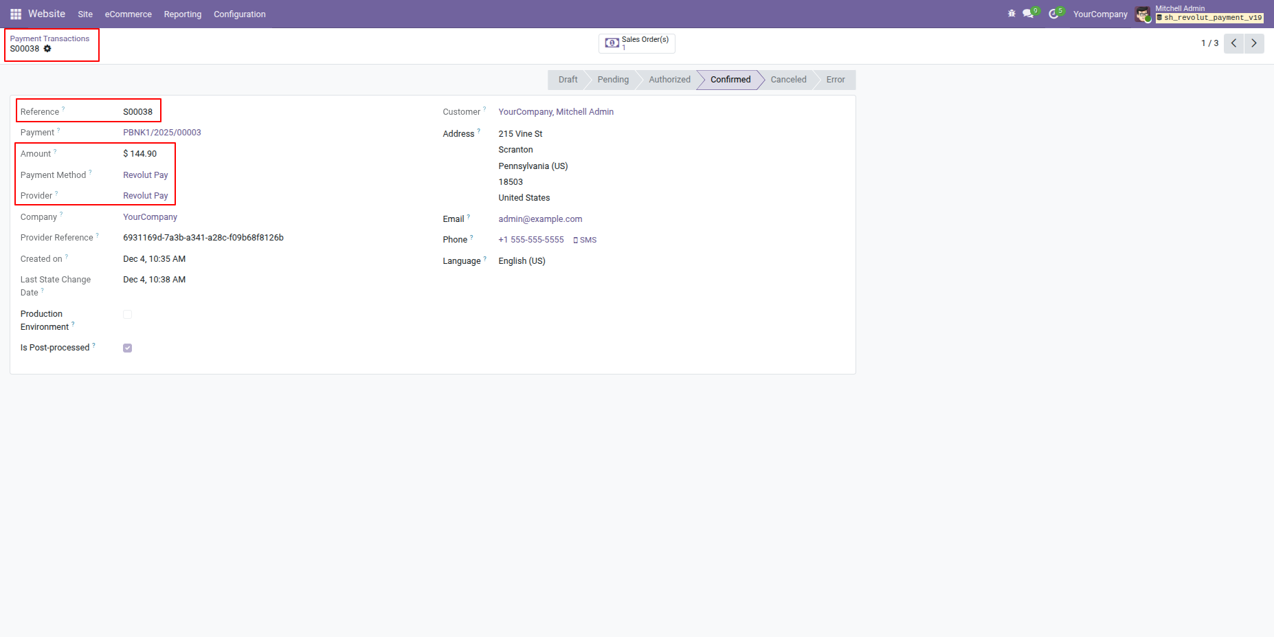 The Revolut Payment Provider module seamlessly integrates your Odoo store with the Revolut payment gateway, enabling fast and secure online payments through supported credit/debit cards and other Revolut payment methods. It enhances the checkout experience with customizable payment status messages and automatic notifications, while offering full multi-website compatibility so each site can manage its own payment settings. The module also supports processing refunds directly from Odoo for smoother cancellations, maintains complete transaction history for easy tracking, and handles multi-currency payments with accurate conversions. Additionally, customers can securely pay through a dedicated self-service payment portal, ensuring a reliable and convenient payment experience for your e-commerce business.