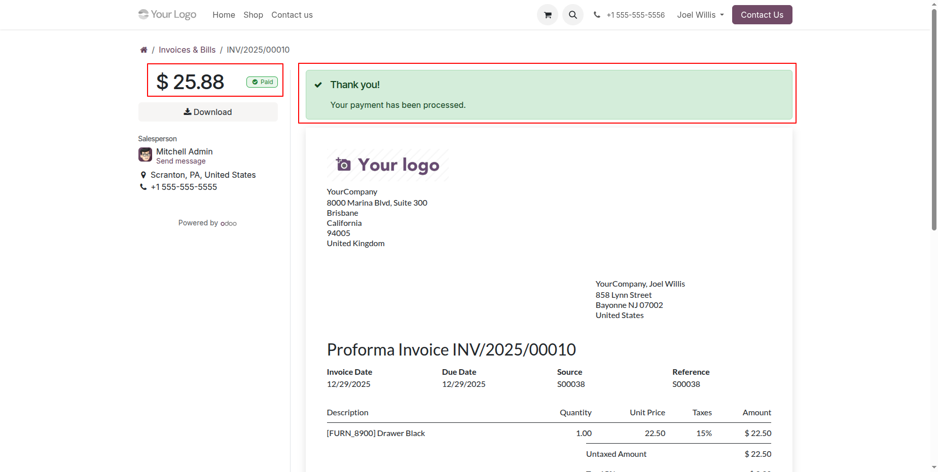 Payment transaction form view with all details.