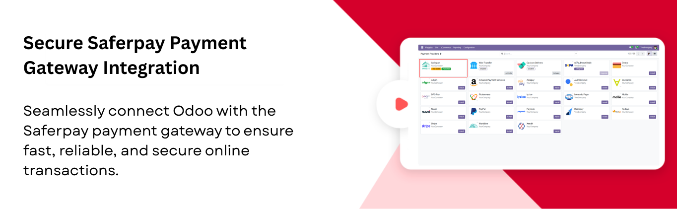 The Saferpay Payment Provider module seamlessly integrates your Odoo store with the Saferpay payment gateway, enabling fast and secure online payments through supported credit/debit cards and other Saferpay payment methods. It enhances the checkout experience with customizable payment status messages and automatic notifications, while offering full multi-website compatibility so each site can manage its own payment settings. The module also supports processing refunds directly from Odoo for smoother cancellations, maintains complete transaction history for easy tracking, and handles multi-currency payments with accurate conversions. Additionally, customers can securely pay through a dedicated self-service payment portal, ensuring a reliable and convenient payment experience for your e-commerce business.