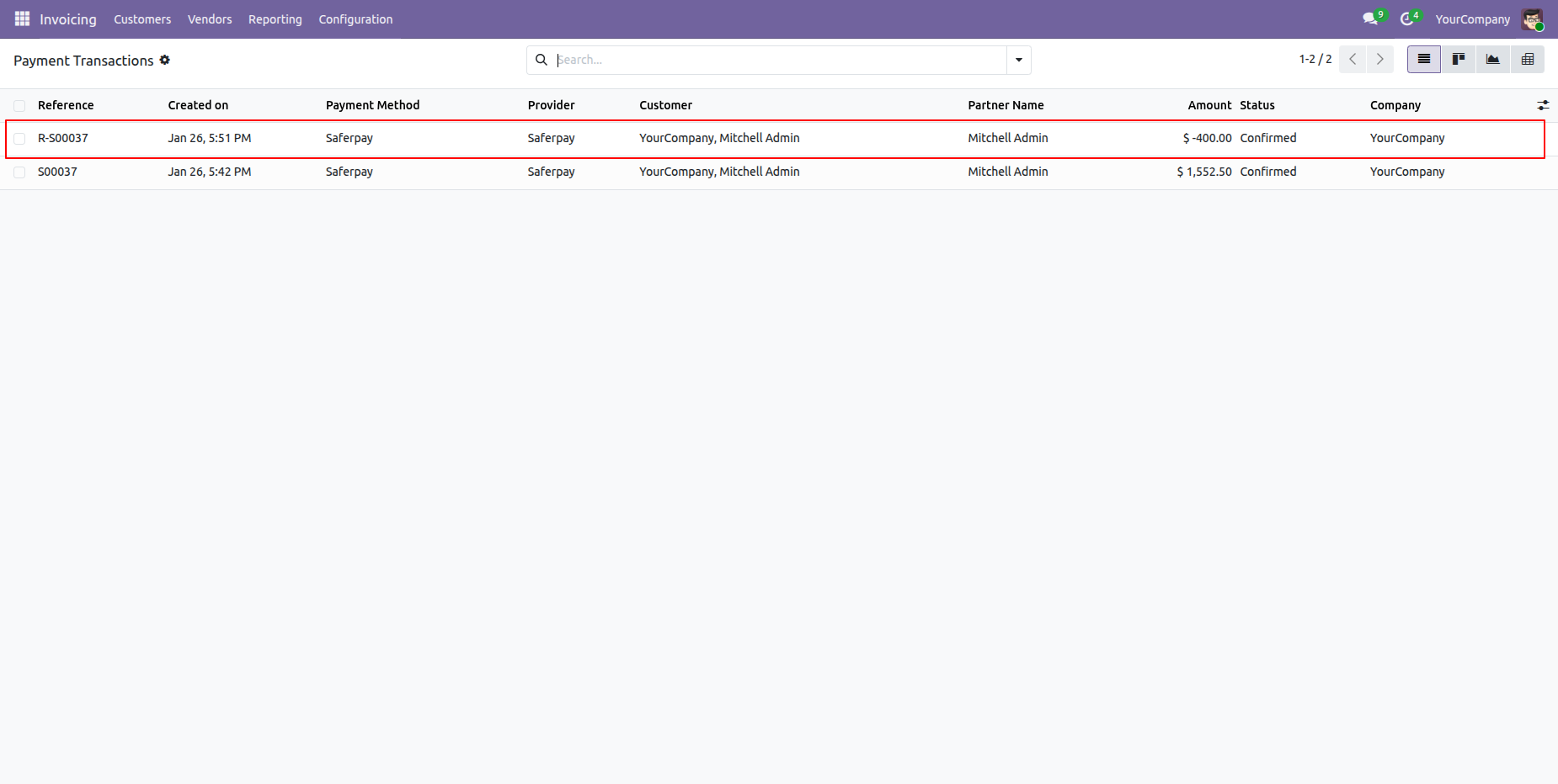 Payment transactions form view with refund details.