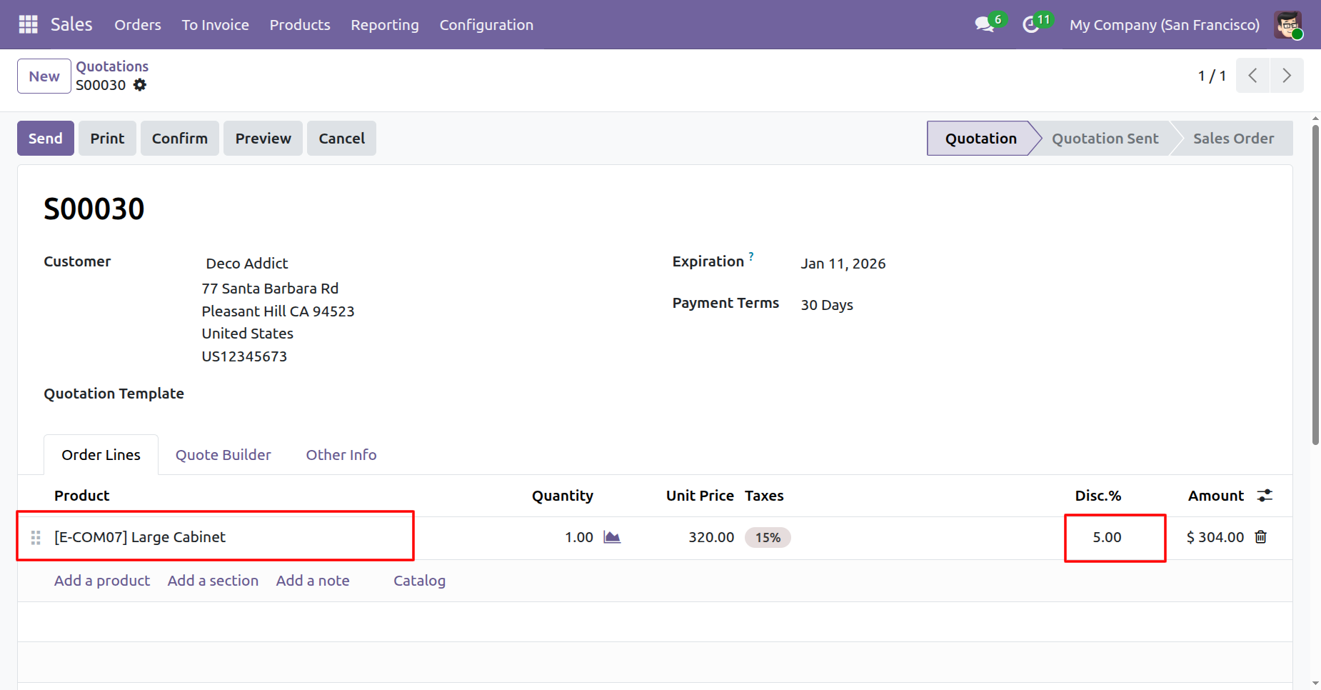 Creating a Sale Order and entering a discount percentage that is within the allowed range limit.