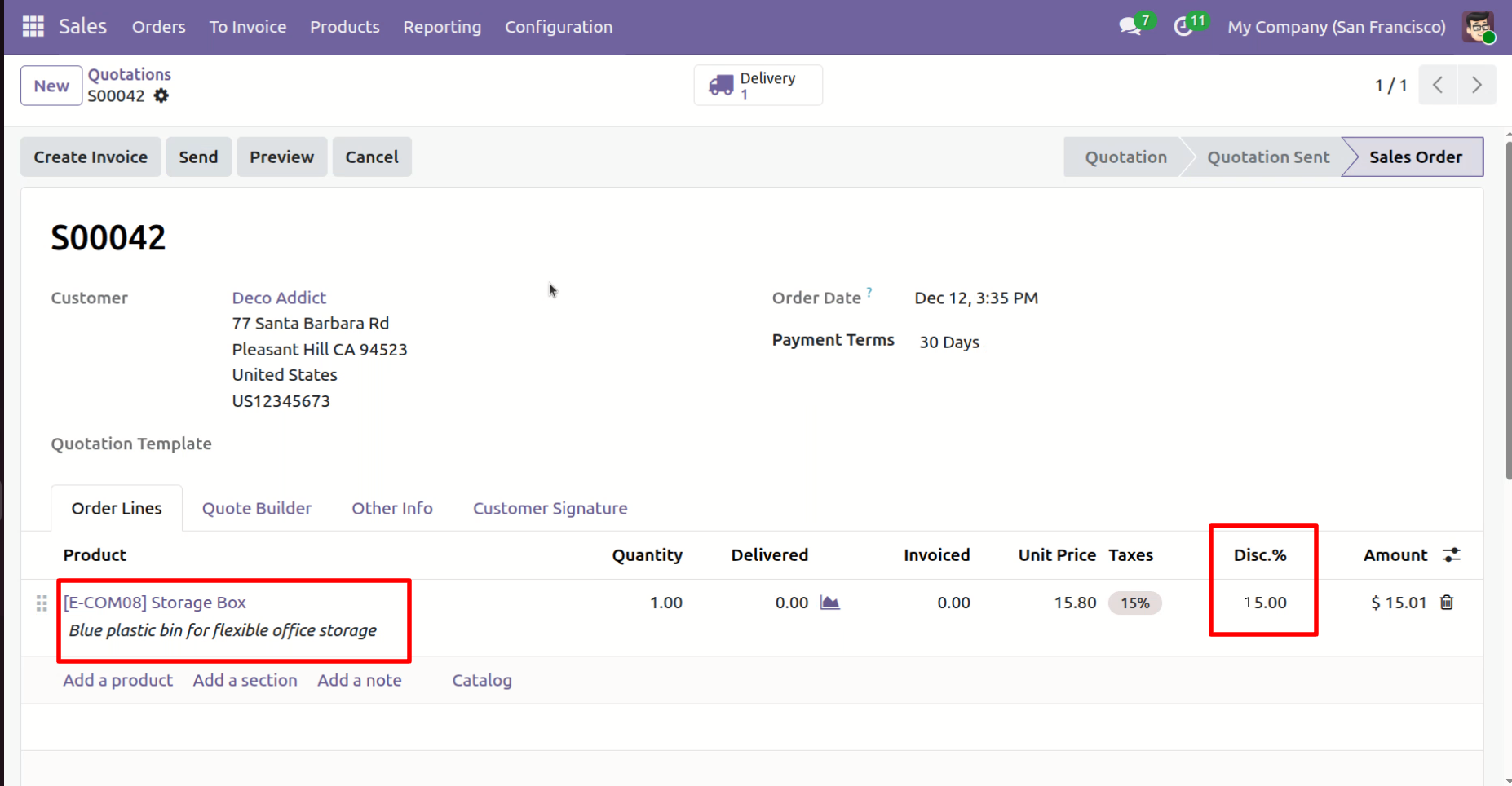 Creating a Sale Order and entering a discount percentage that is within the allowed range limit.