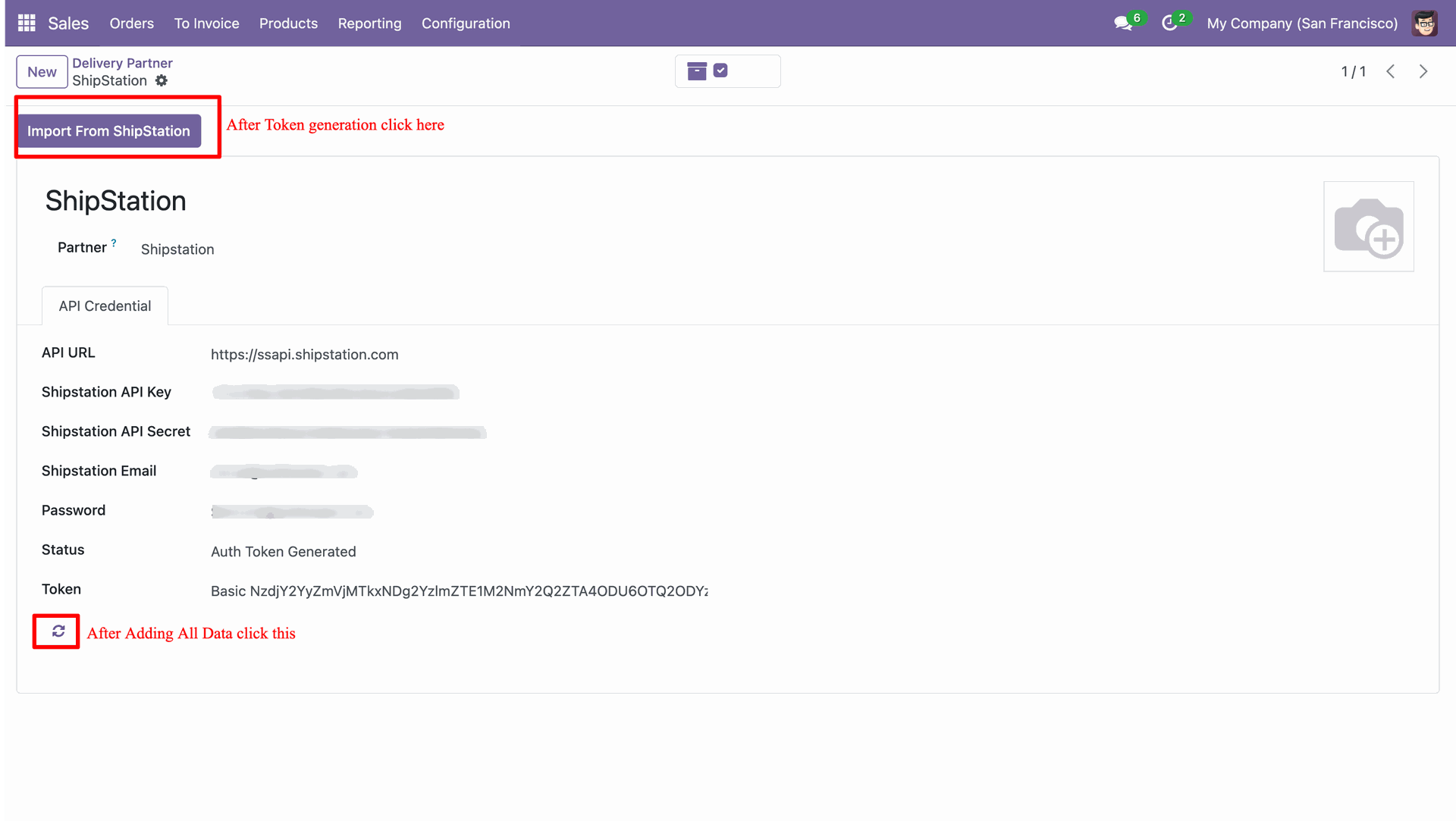 Enter your ShipStation API credentials, generate the authentication token, and then click Import From ShipStation to sync data. After filling in all details, click the refresh button to update and validate the connection.