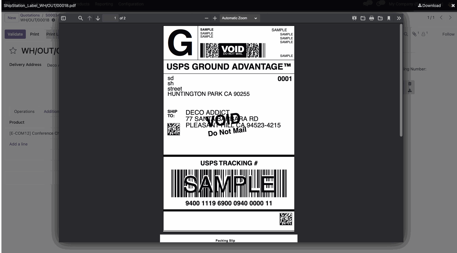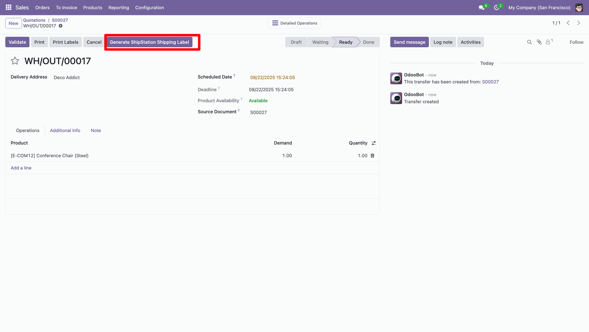In the delivery order form view, click the 'Generate ShipStation Shipping Label' button.