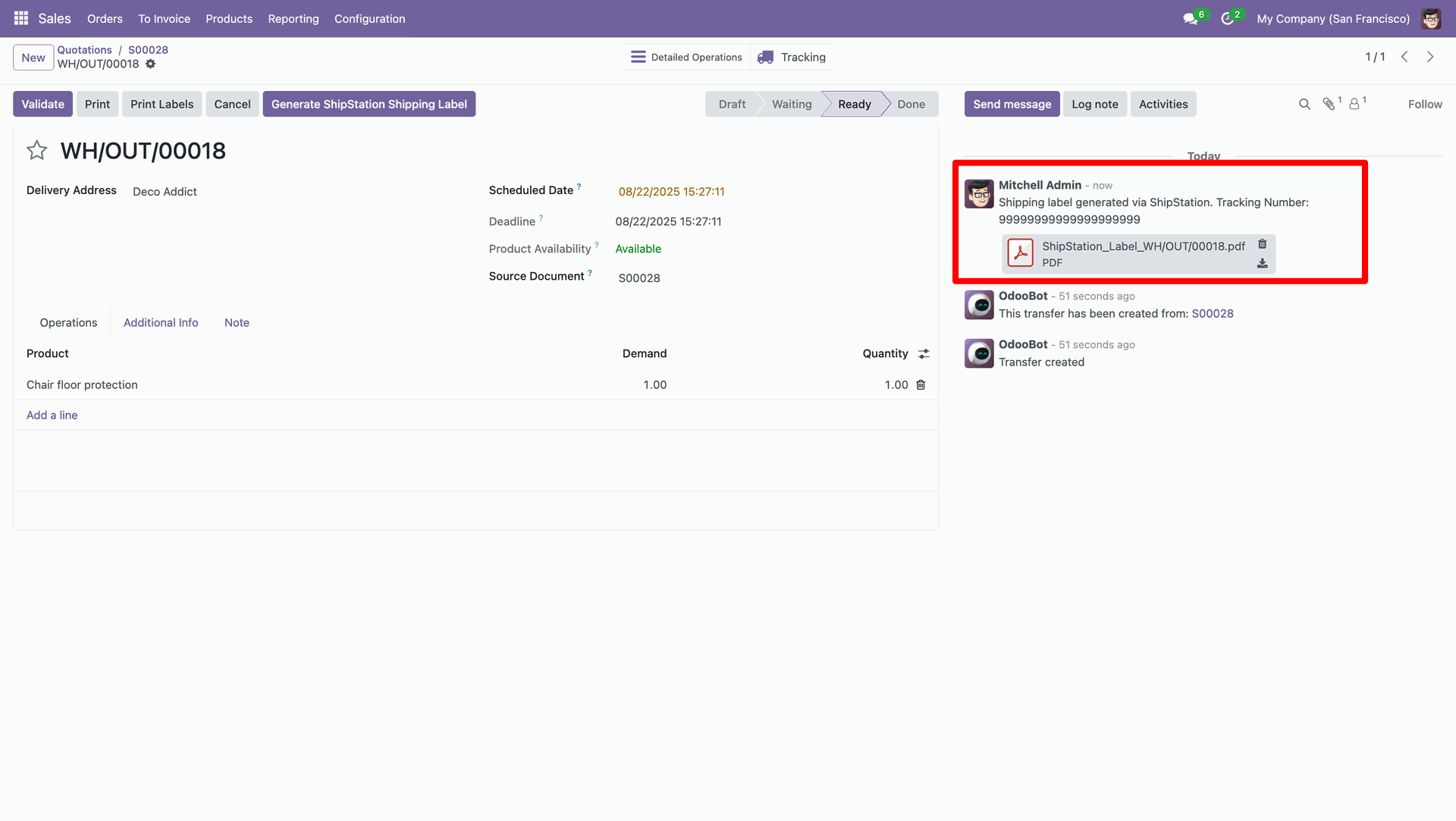 In the log note, it shows that the shipping label was successfully generated, along with a downloadable PDF link.