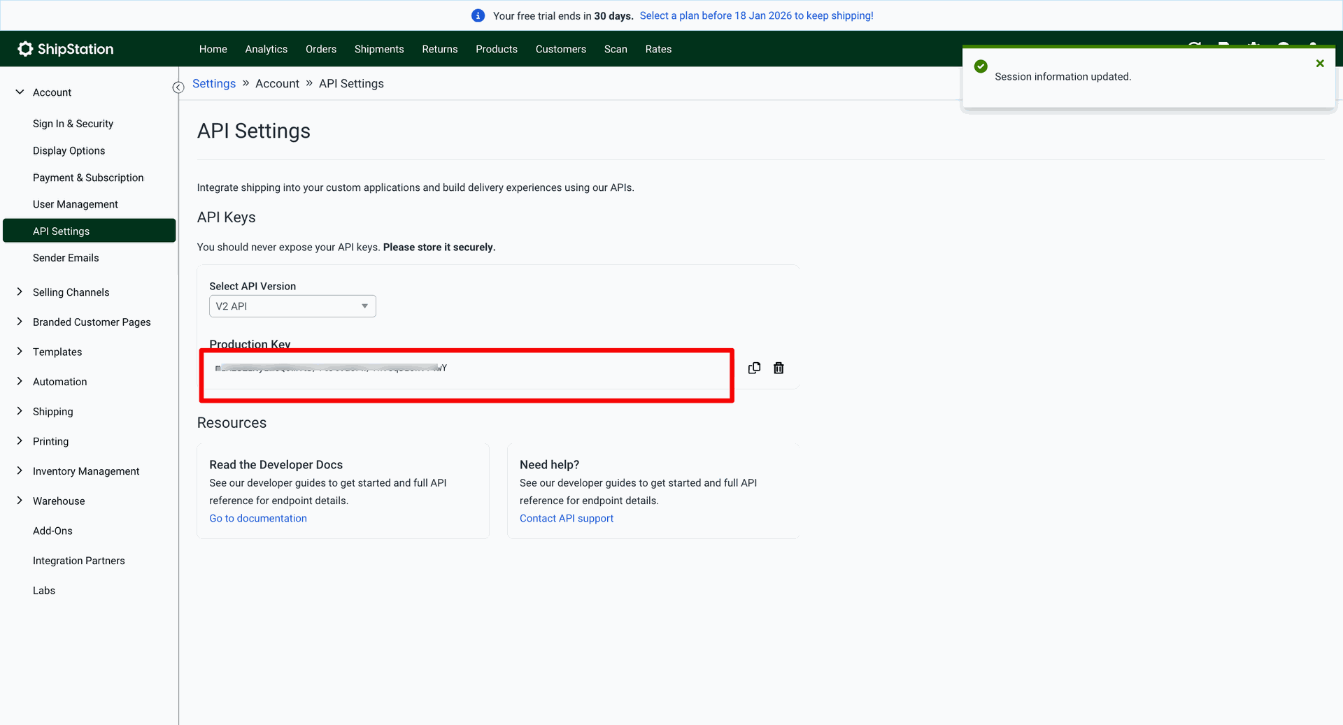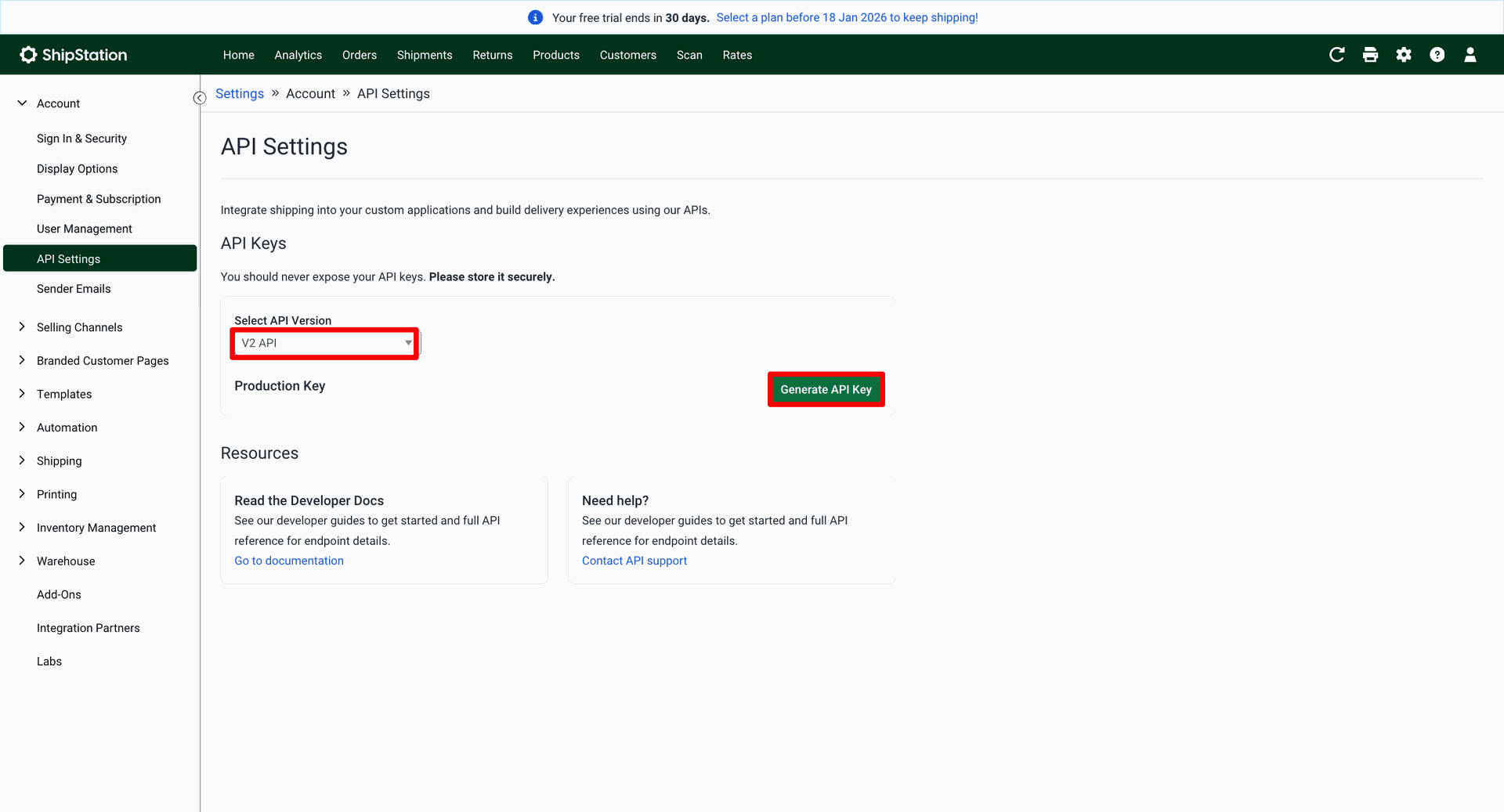 Open ShipStation. Go to the "Account" ==> API Settings. To generate the API key, click on the 'Generate API Key' button.