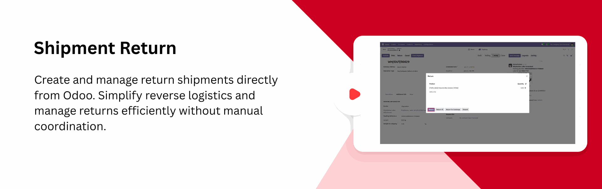 Create and process return shipments directly from Odoo with a single click to ensure smooth and hassle-free reverse logistics.