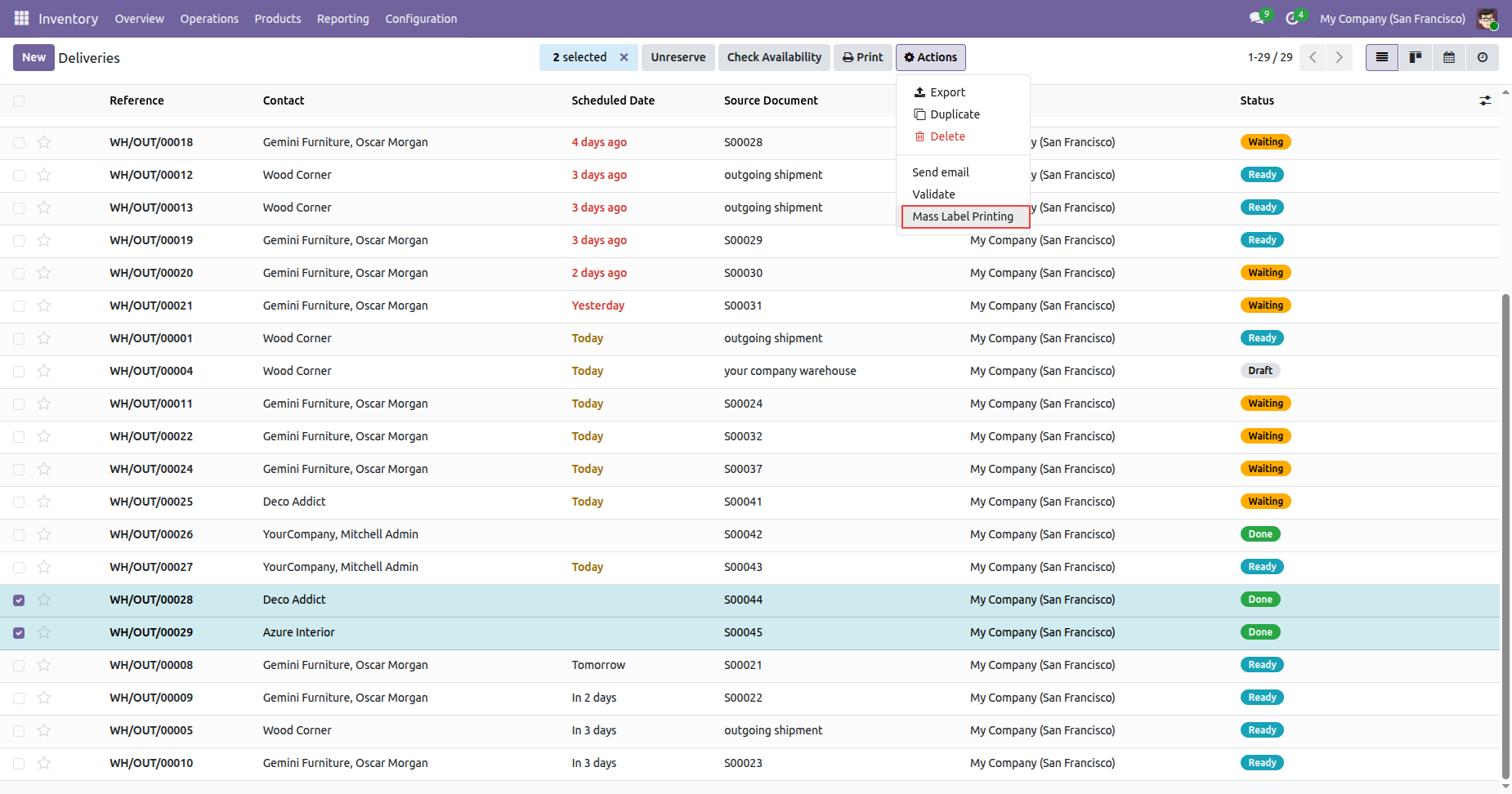 Select deliveries and click Action -> Mass Label Printing.