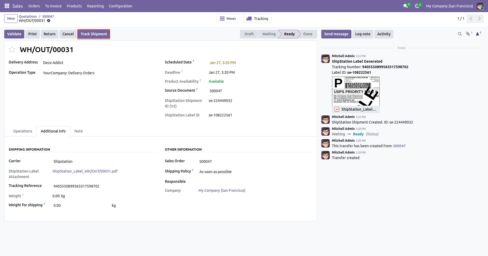 In the log note, it shows that the shipping label was successfully generated, along with a downloadable PDF link.