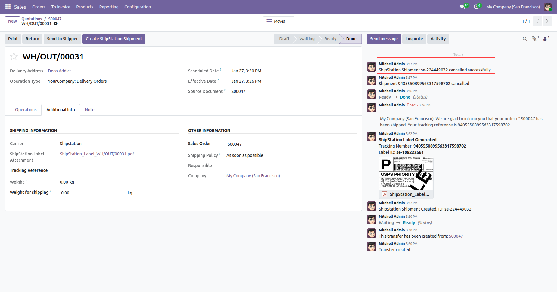 Shipment cancelled with a chatter message.
