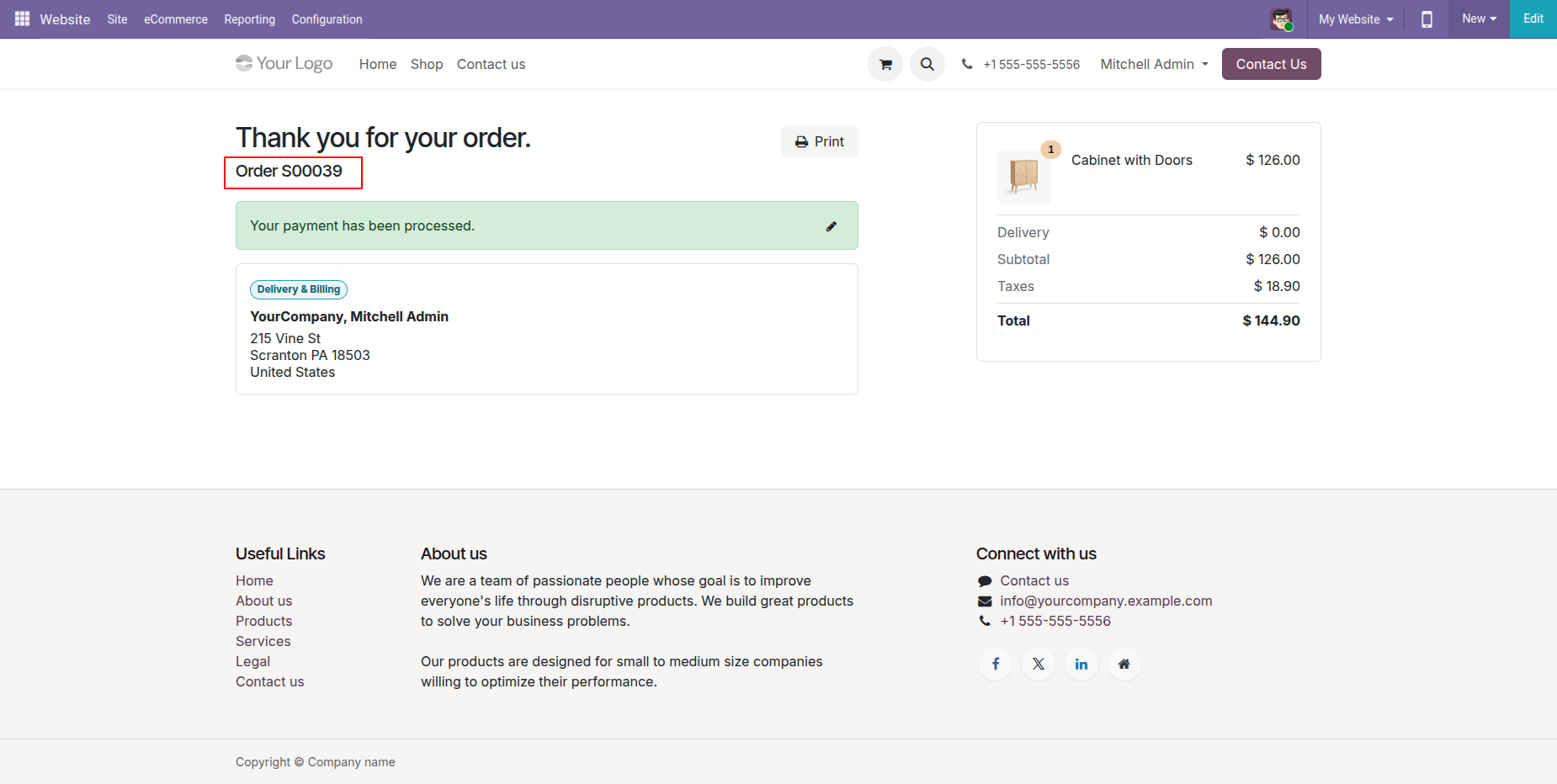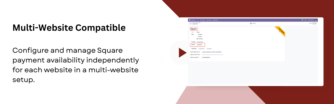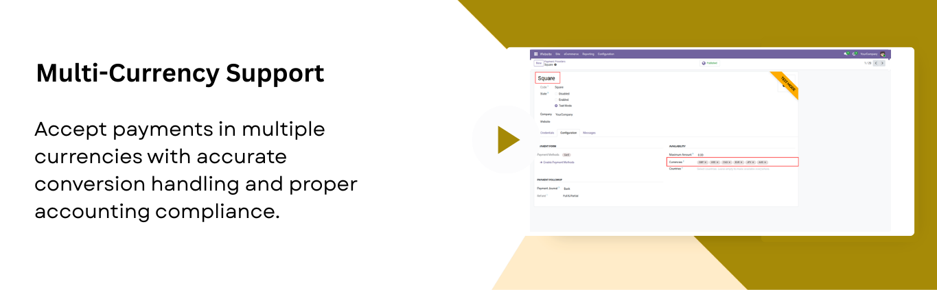 The Square Payment Provider module seamlessly integrates your Odoo store with the Square payment gateway, enabling fast and secure online payments through supported credit/debit cards and other Square payment methods. It enhances the checkout experience with customizable payment status messages and automatic notifications, while offering full multi-website compatibility so each site can manage its own payment settings. The module also supports processing refunds directly from Odoo for smoother cancellations, maintains complete transaction history for easy tracking, and handles multi-currency payments with accurate conversions. Additionally, customers can securely pay through a dedicated self-service payment portal, ensuring a reliable and convenient payment experience for your e-commerce business.