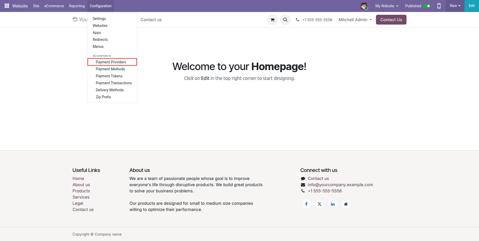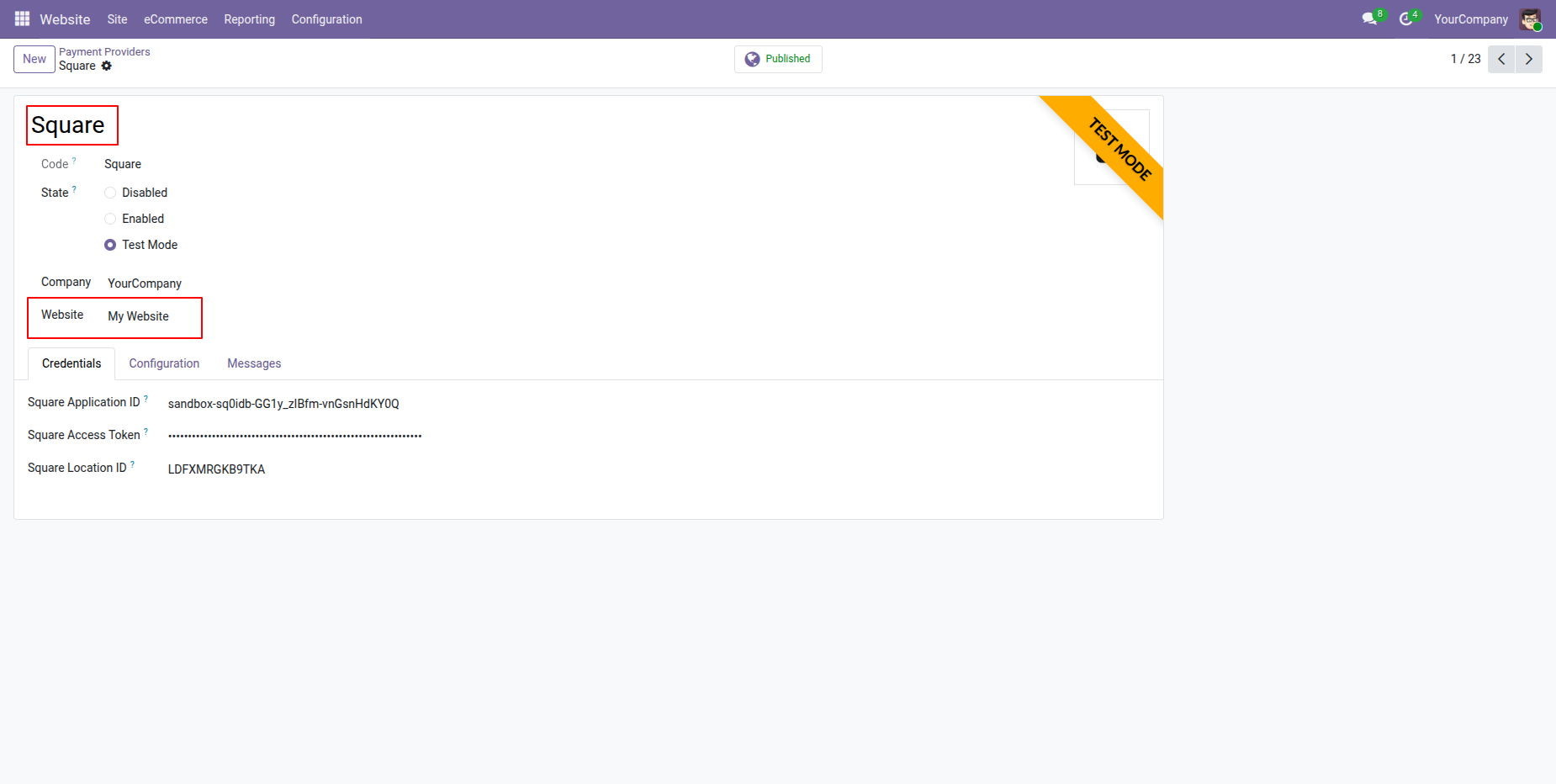 Go to Website -> Configuration -> Payment Providers to access Square settings.