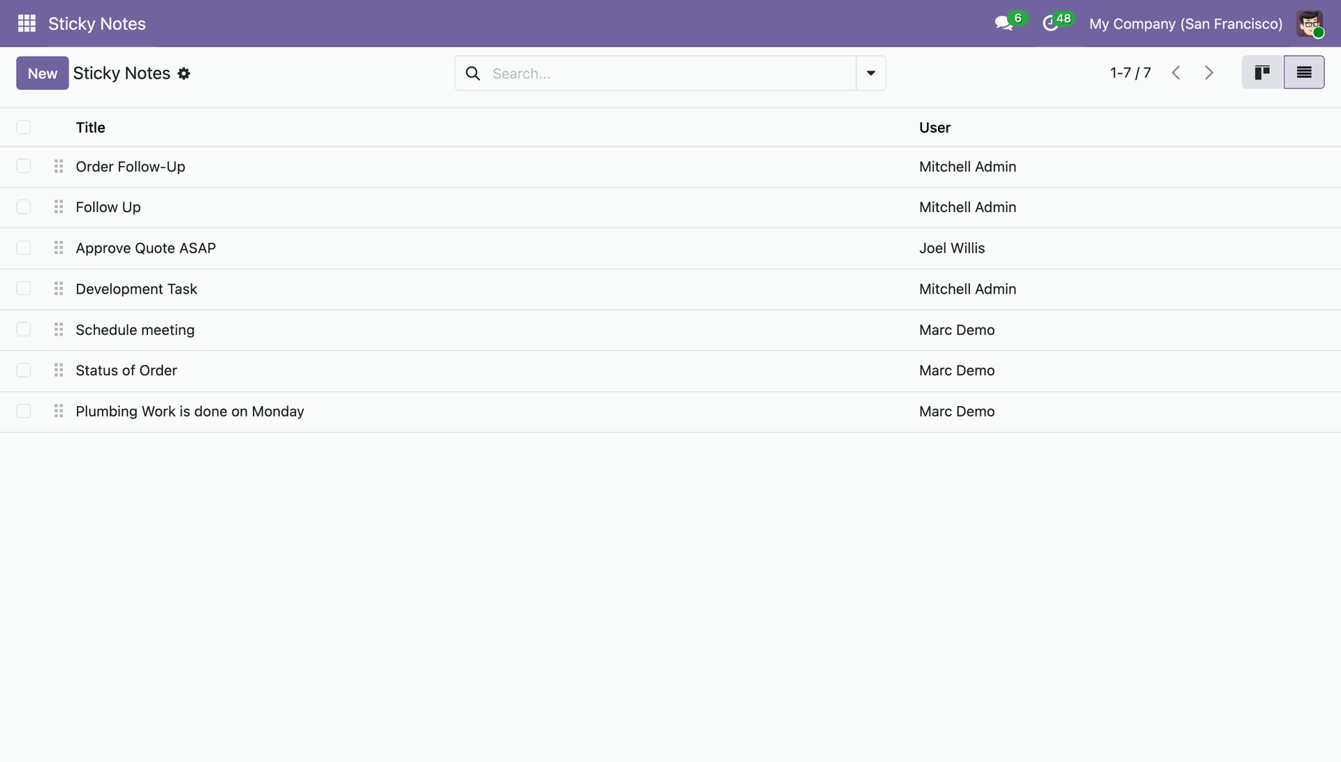 The Sticky Notes list view presents a tabular summary of all notes, detailing the Title and assigned User for efficient task tracking.