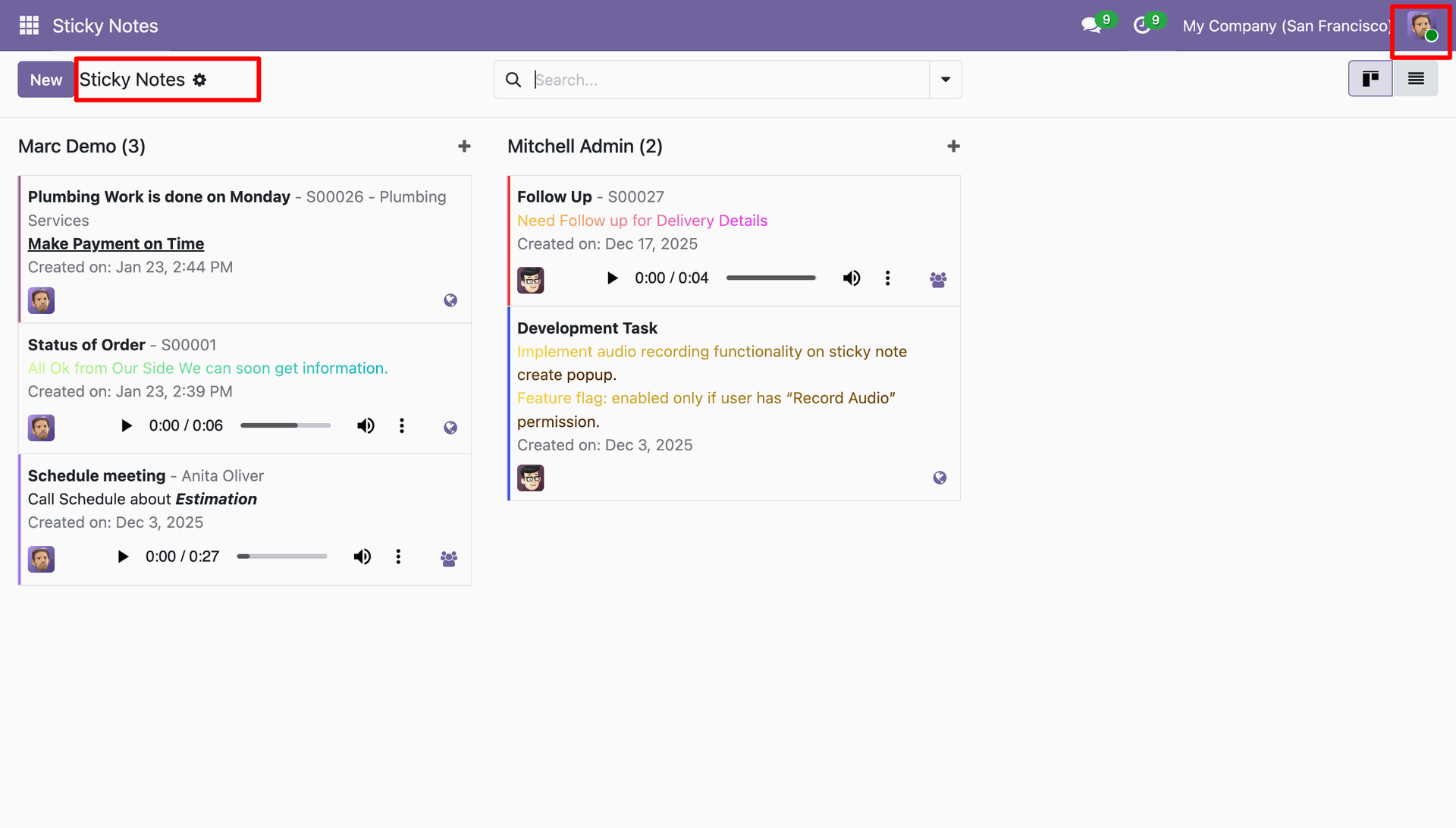 Create sticky notes instantly by using the sticky notes view or by clicking the pin icon of every form view.