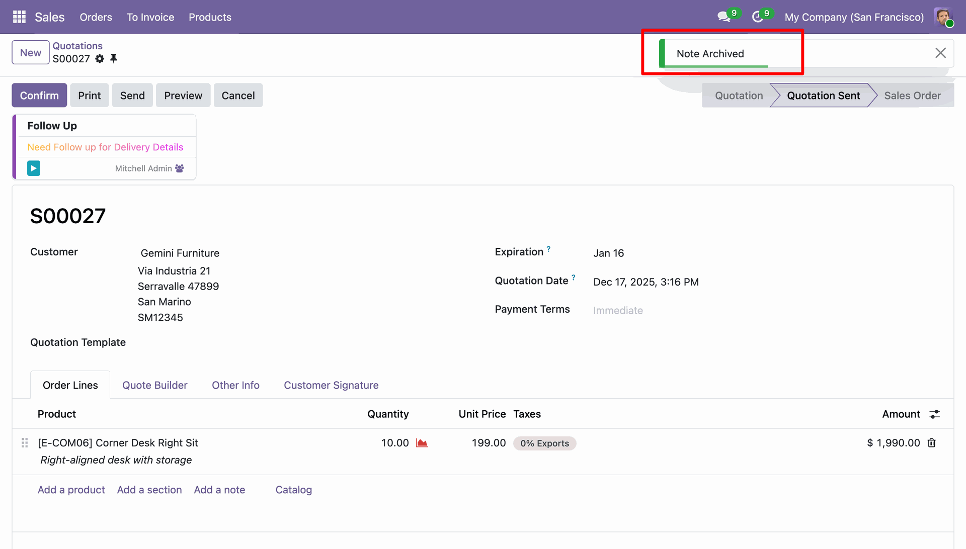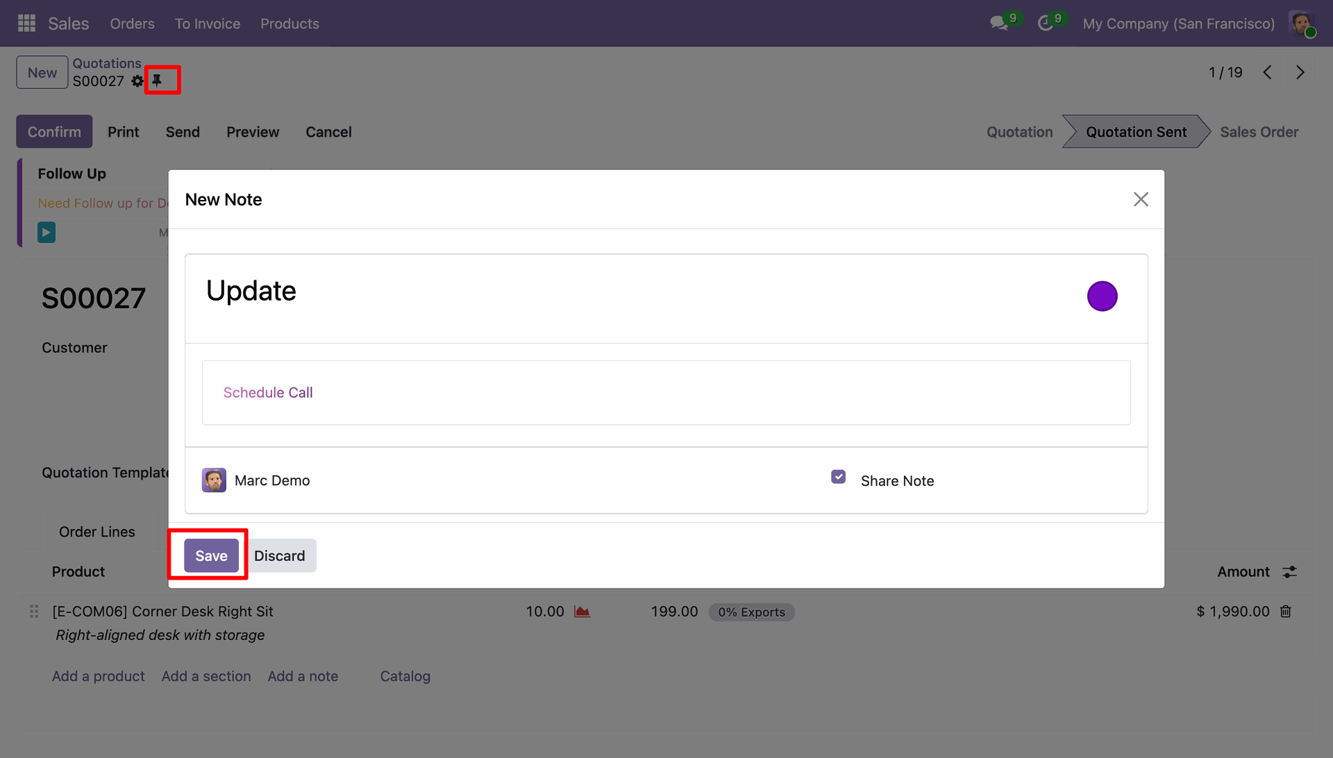 The system displays sticky notes attached to the quotation S00027, highlighting the specific authors (Mitchell Admin and Marc Demo) to facilitate collaborative tracking.