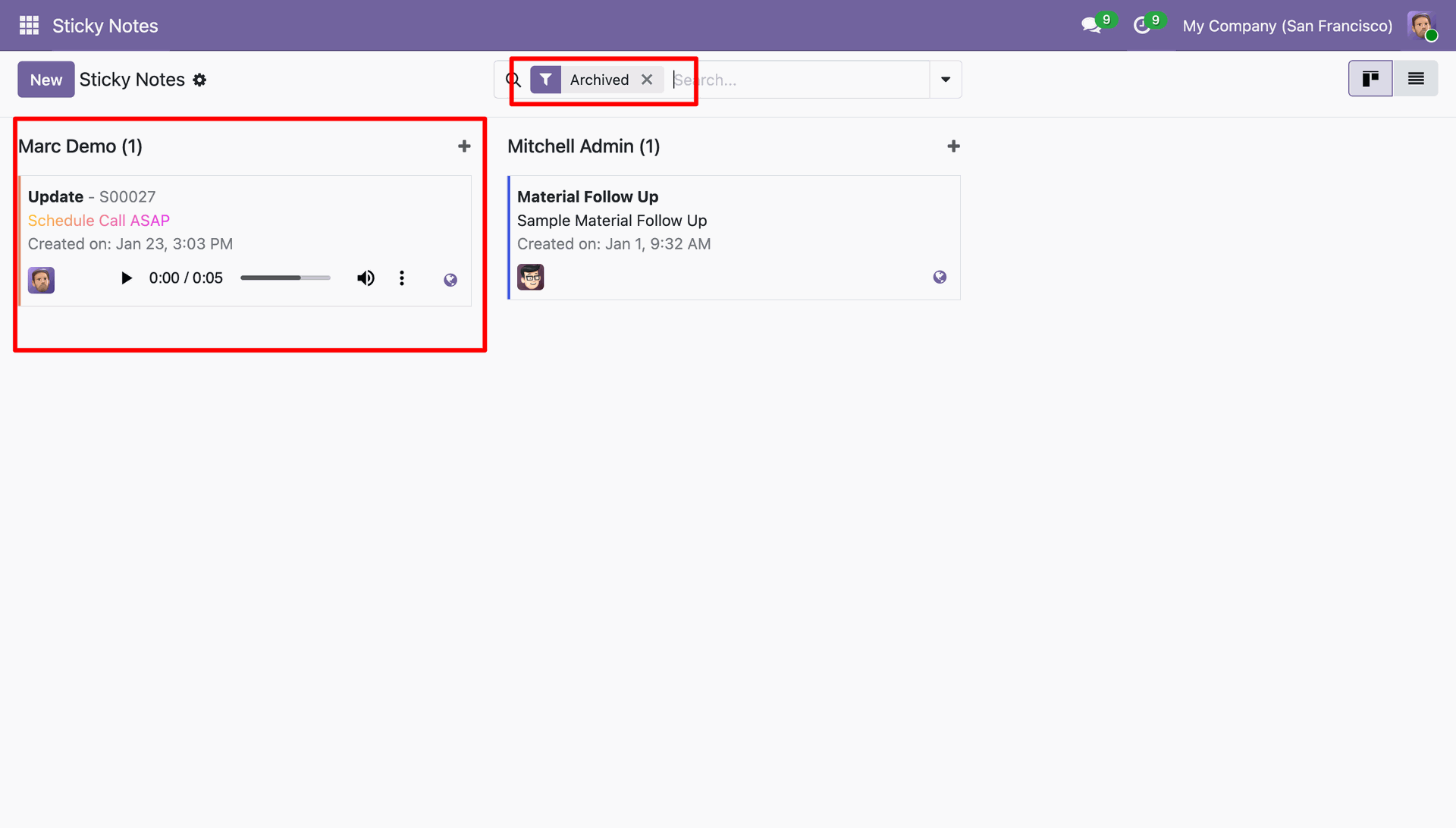 The user can filter or group by the sticky notes.