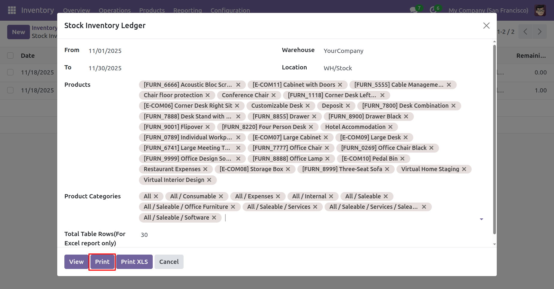 After that, 'Stock Inventory Ladger' wizard will appears.