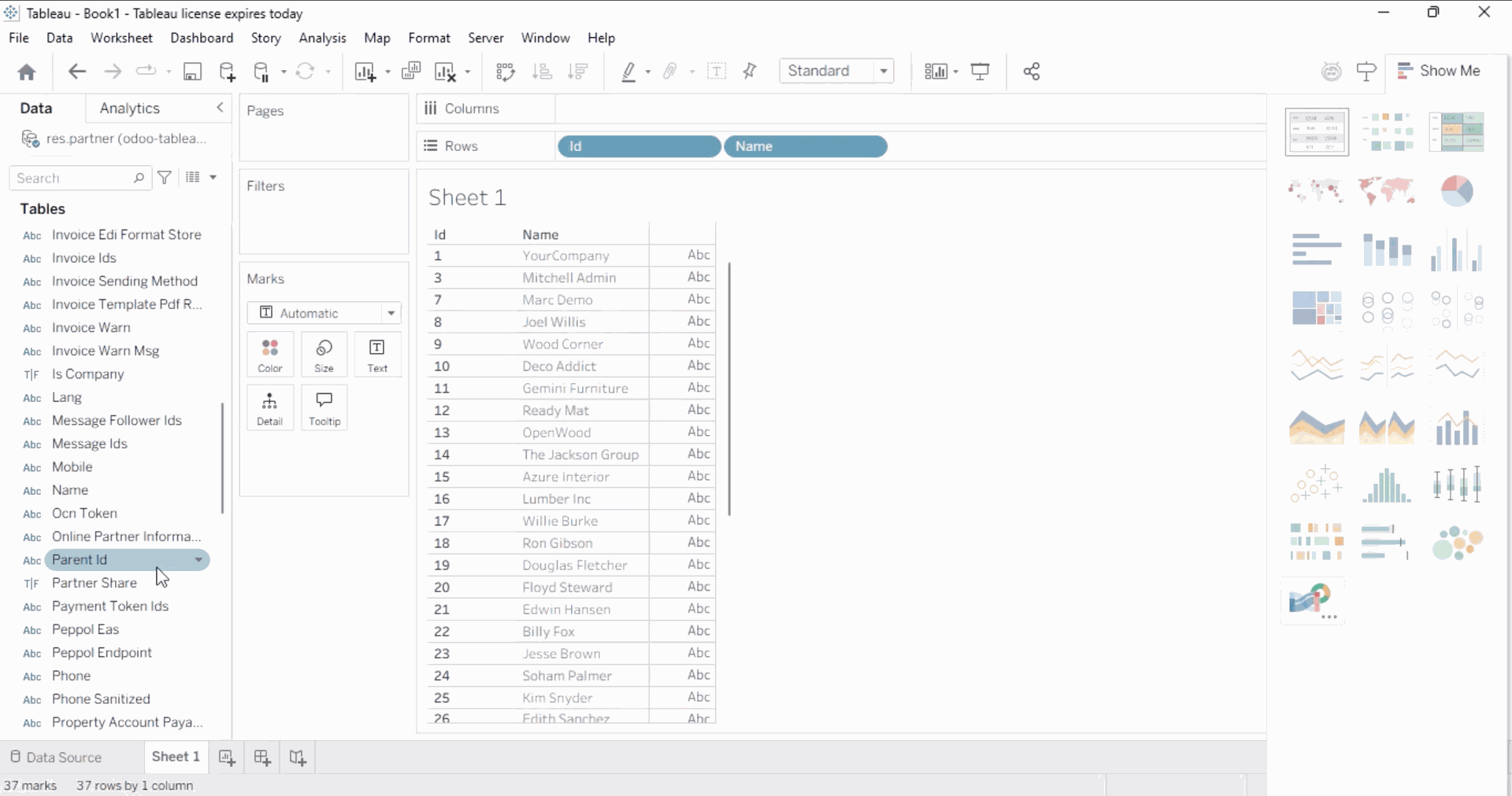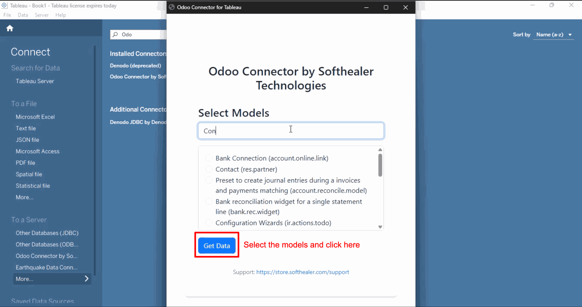 You can search and select any Odoo model directly from the Tableau with a single click.