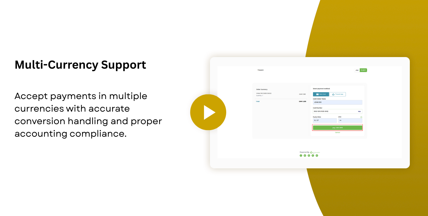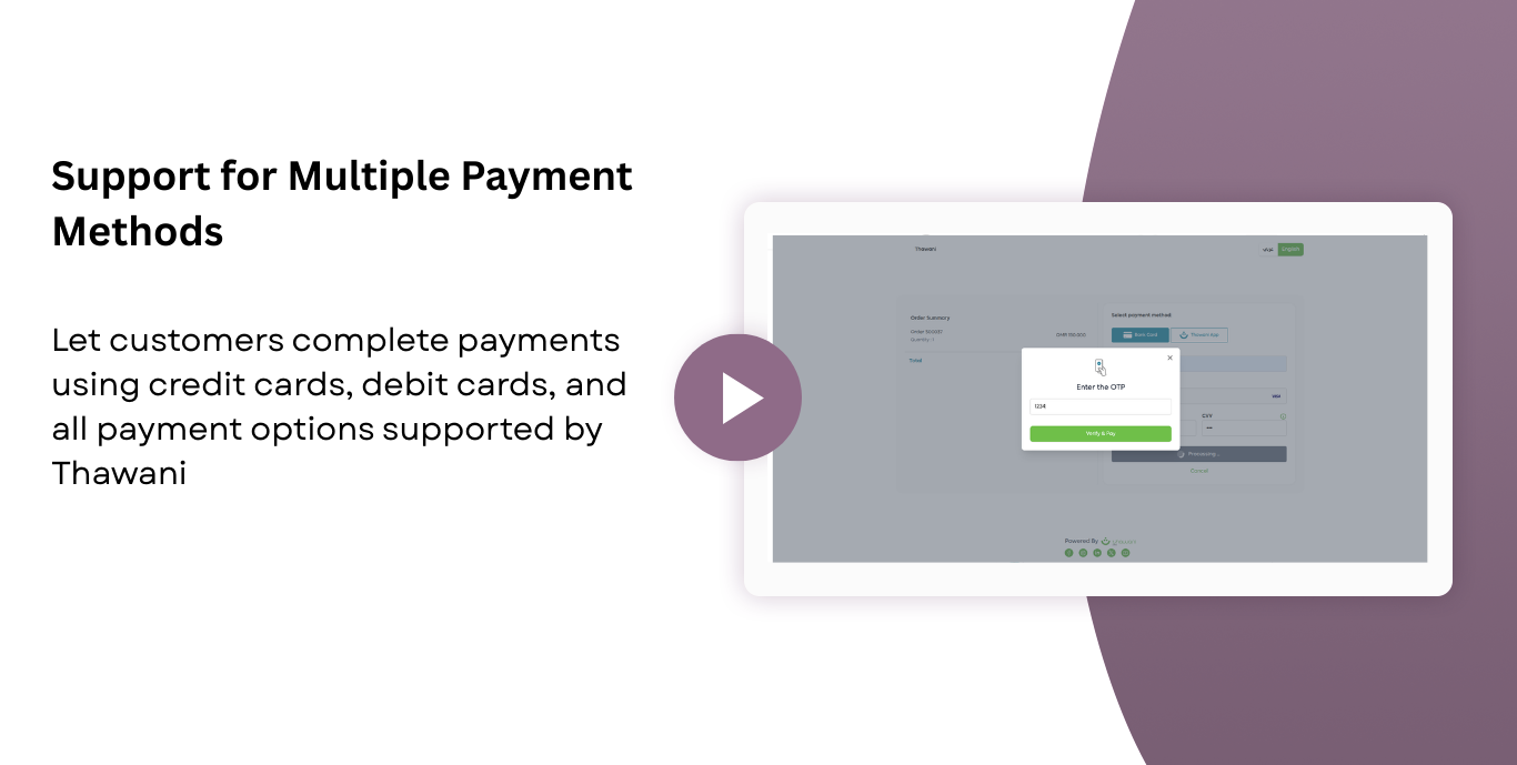 Allow customers to pay via credit/debit cards or any other payment methods supported by Thawani.