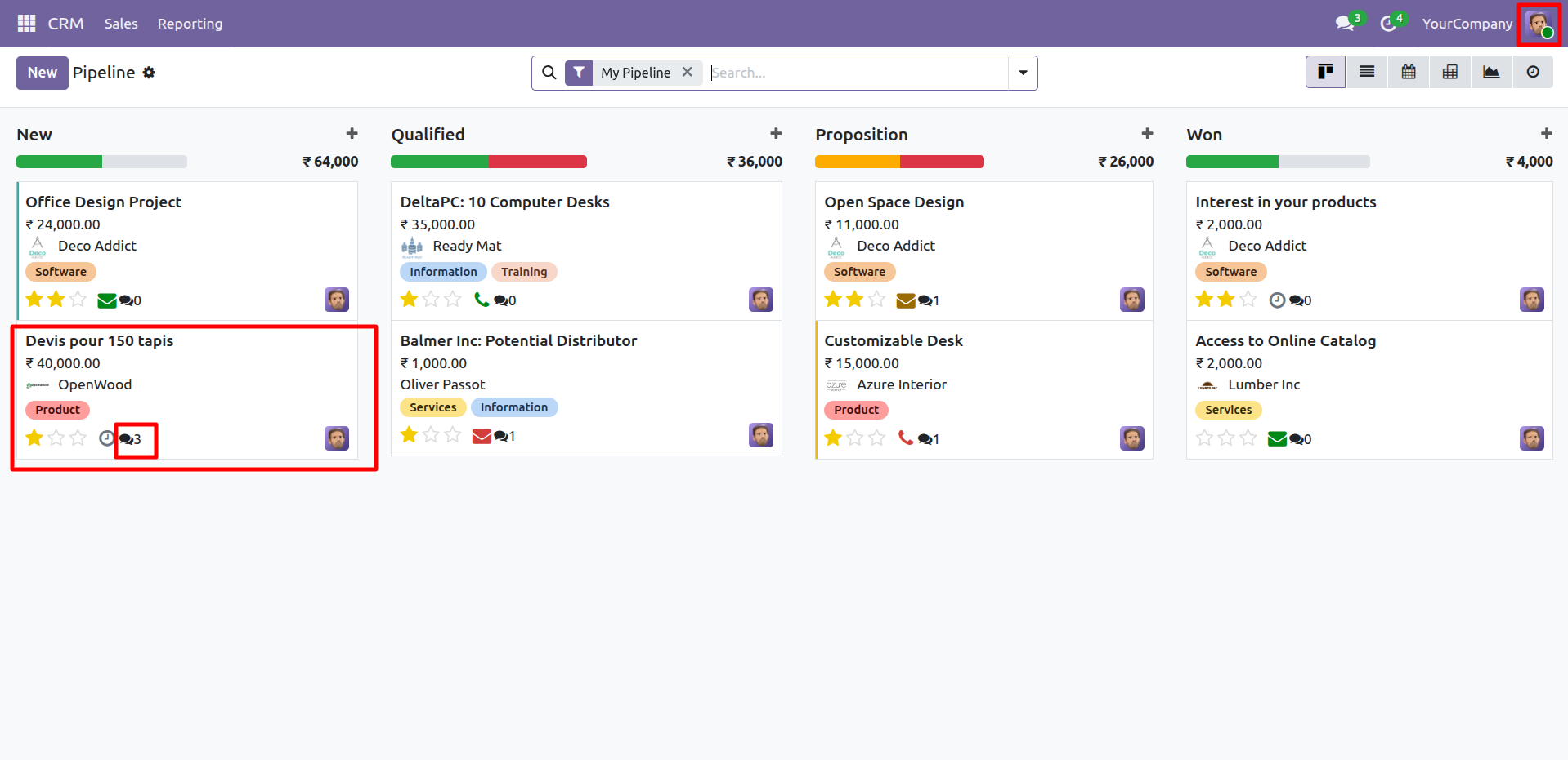 In the CRM lead Kanban view, users can see a counter displaying unread messages.