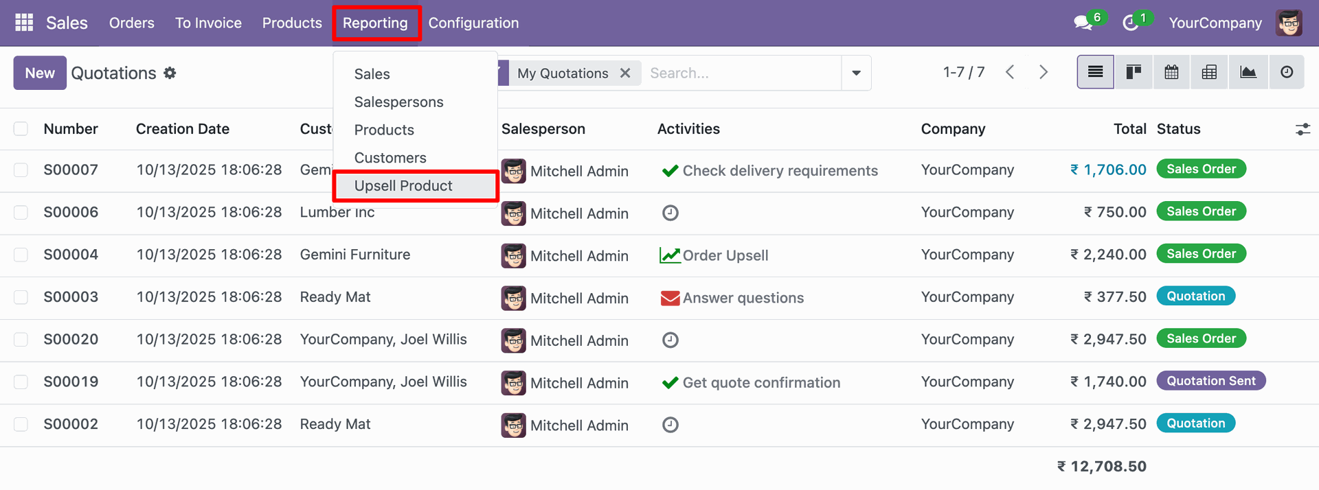 You can select Upsell Product from the Reporting dropdown menu to generate a report on available upsell opportunities within the Sales module.