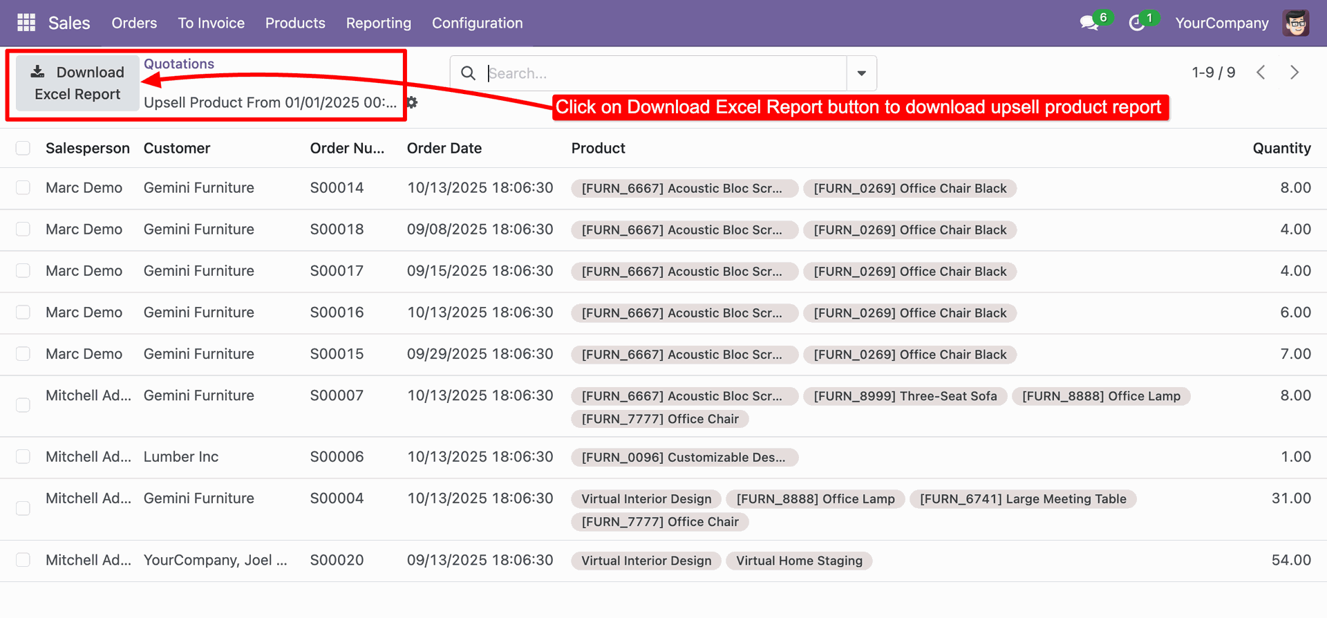 View salesperson, customer, order number, order date, upsell products, and quantities.