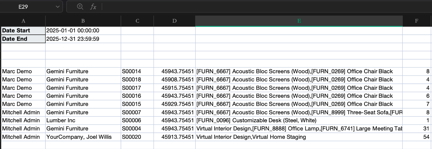 The downloaded Excel file captures the upsell report details, displaying a structured list of orders, products, and quantities for the selected timeframe.
