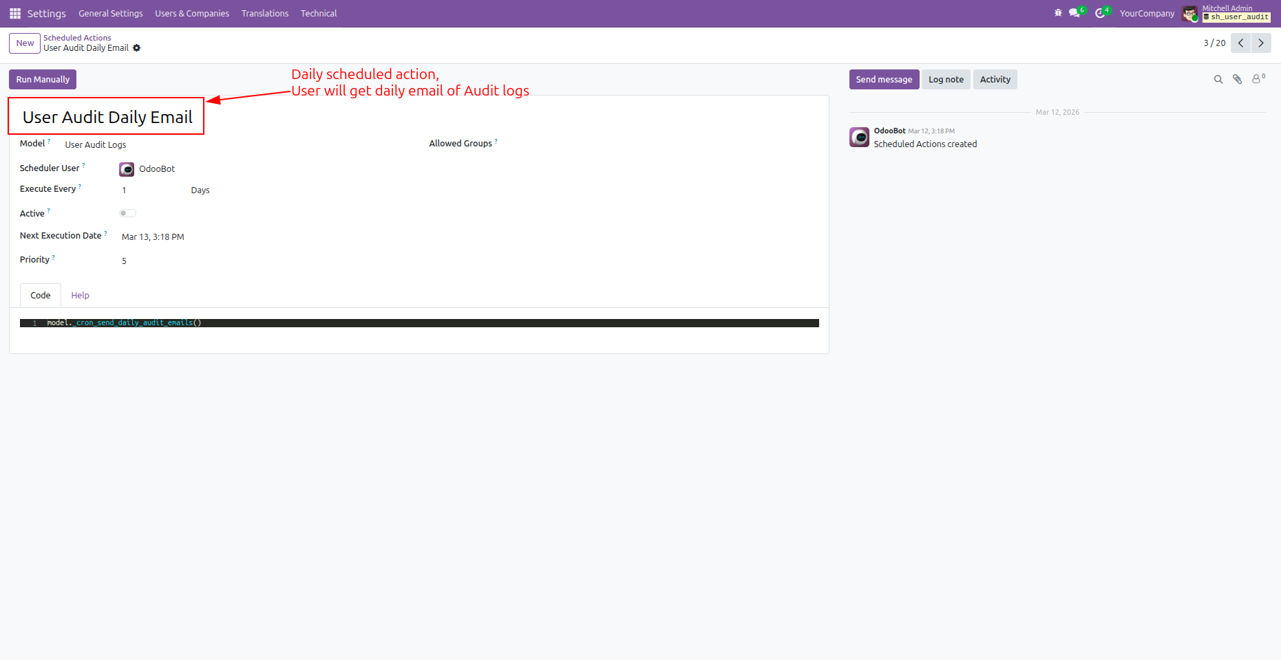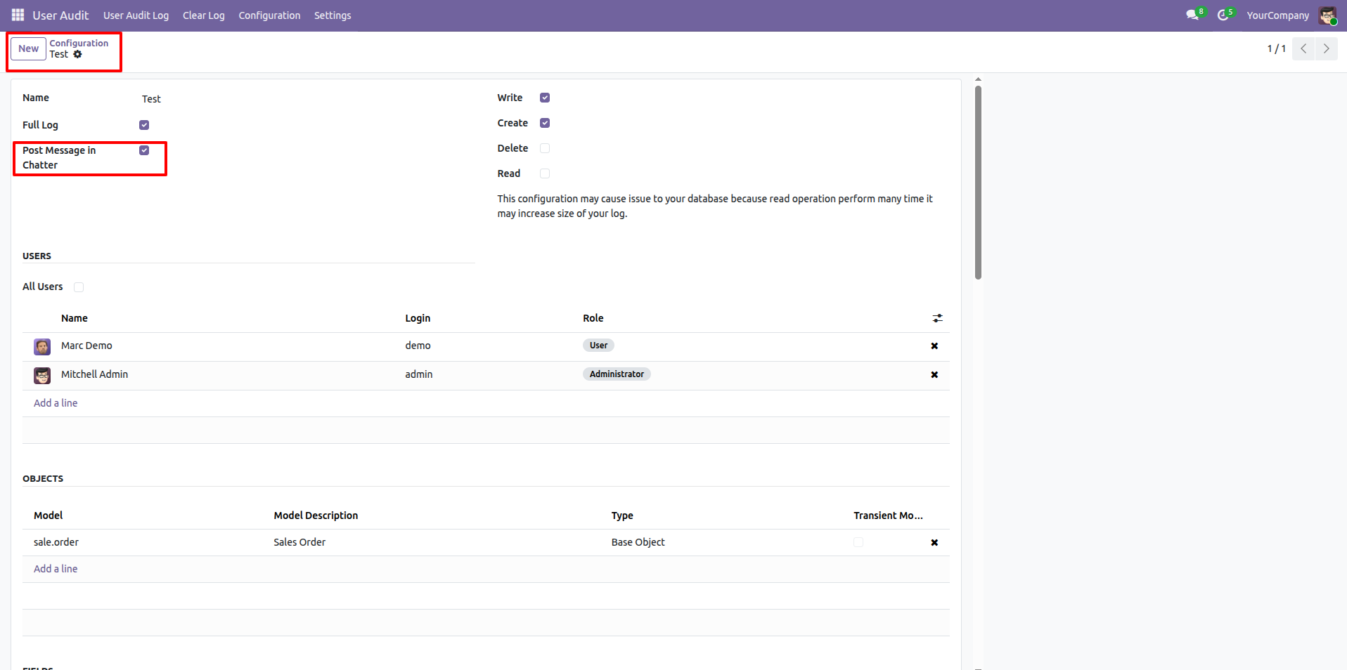- Displays audit log messages directly in the chatter for better tracking and transparency. New