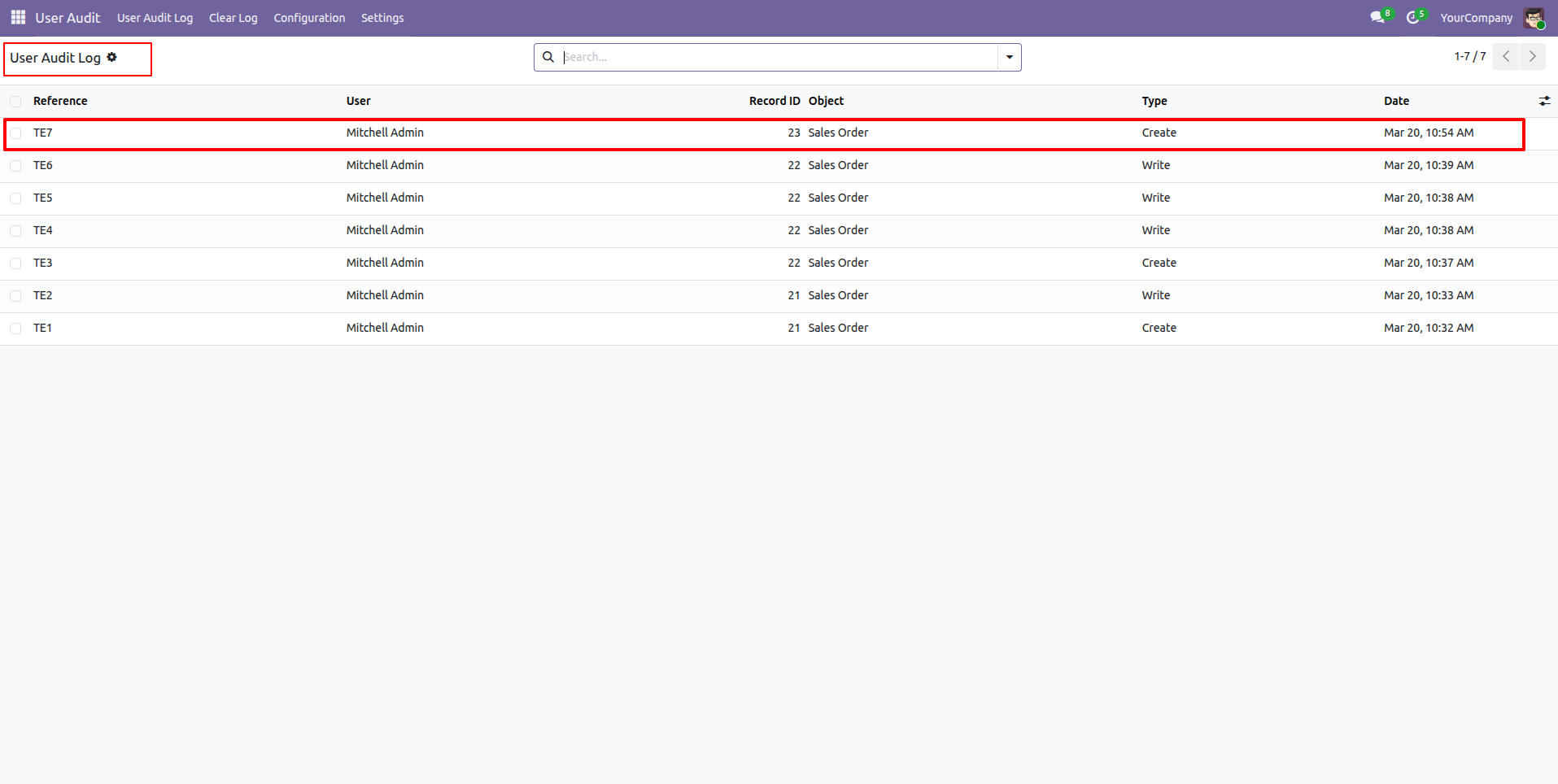 Form view of the User audit log.