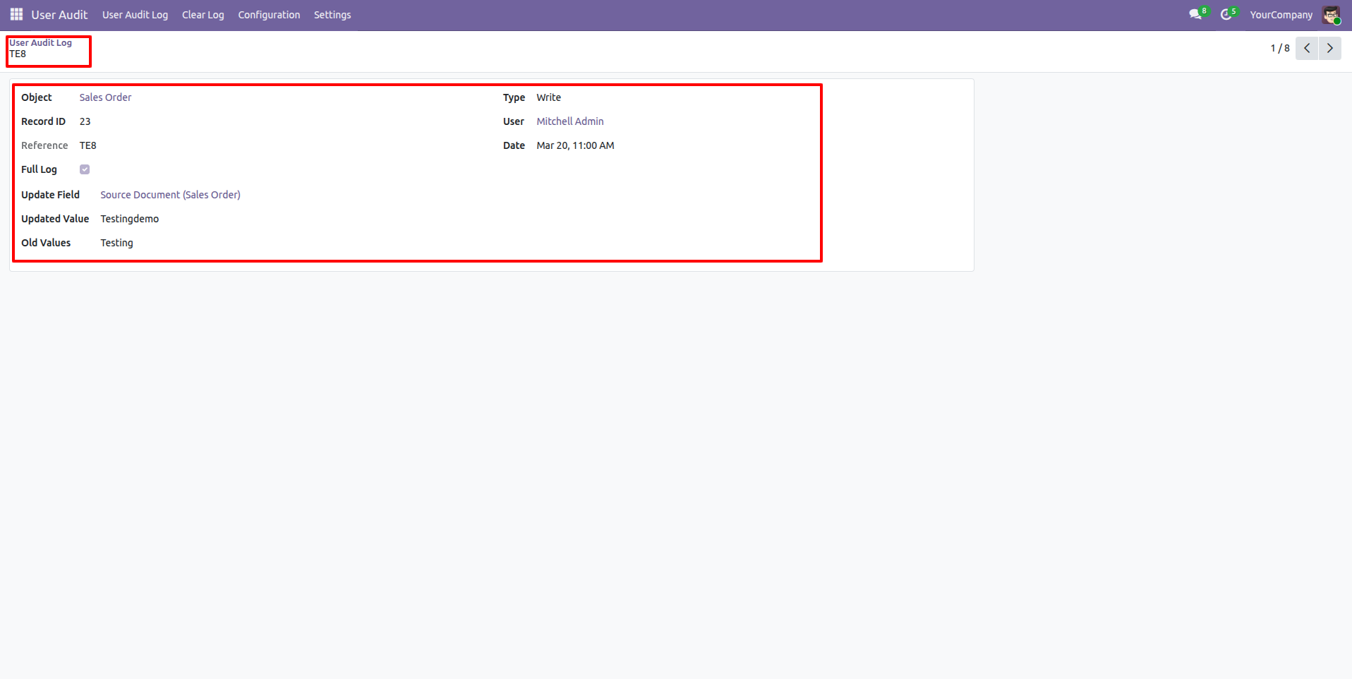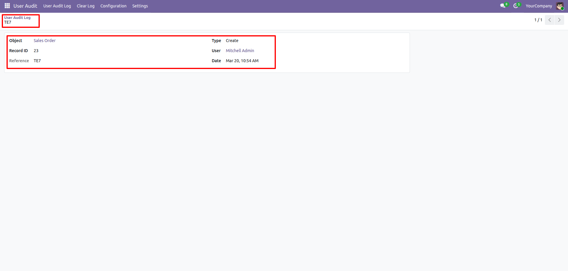 The audit log form view looks like this.