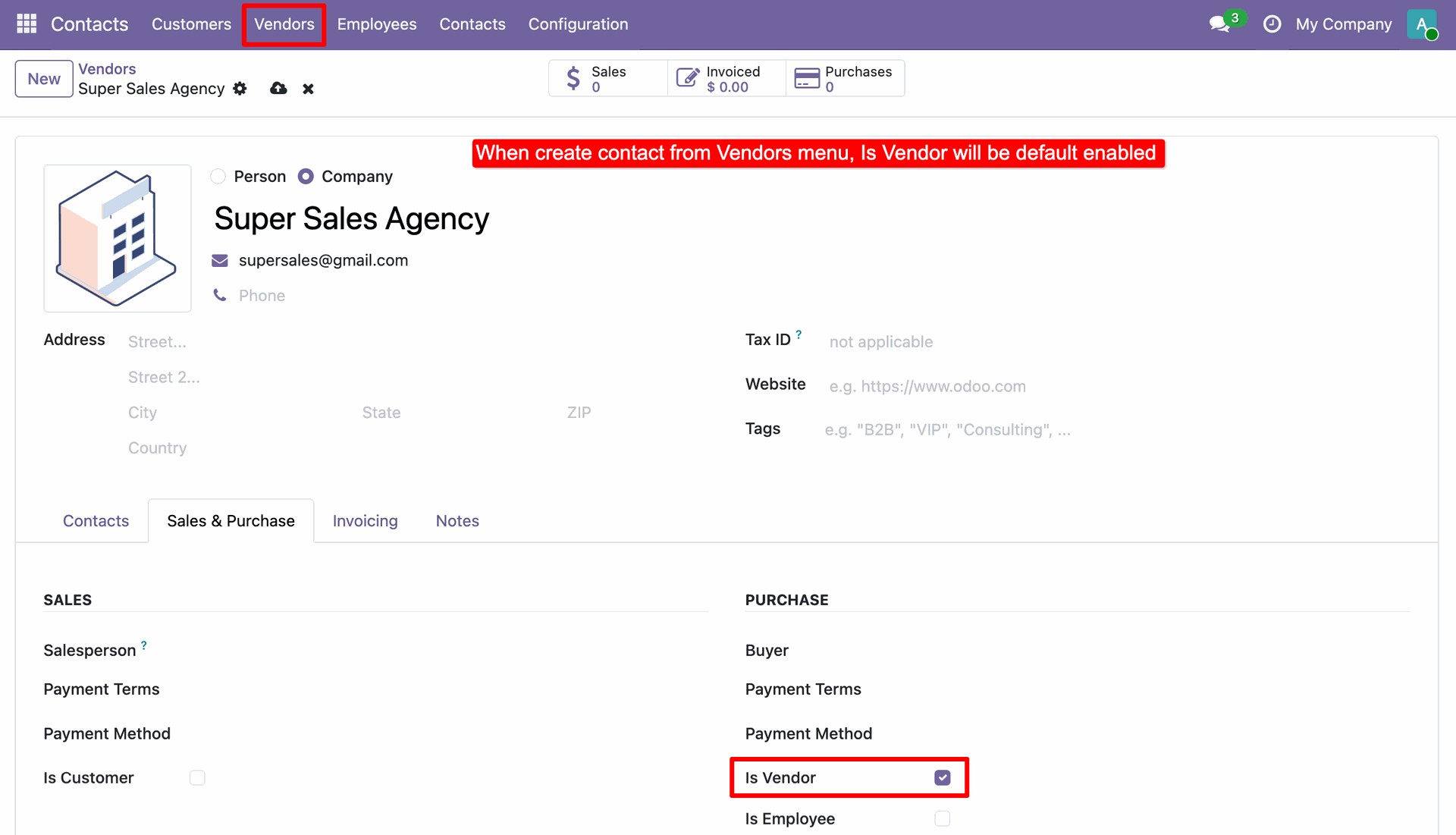 Creating a contact via the "Vendors" menu automatically enables the "Is Vendor" setting by default.