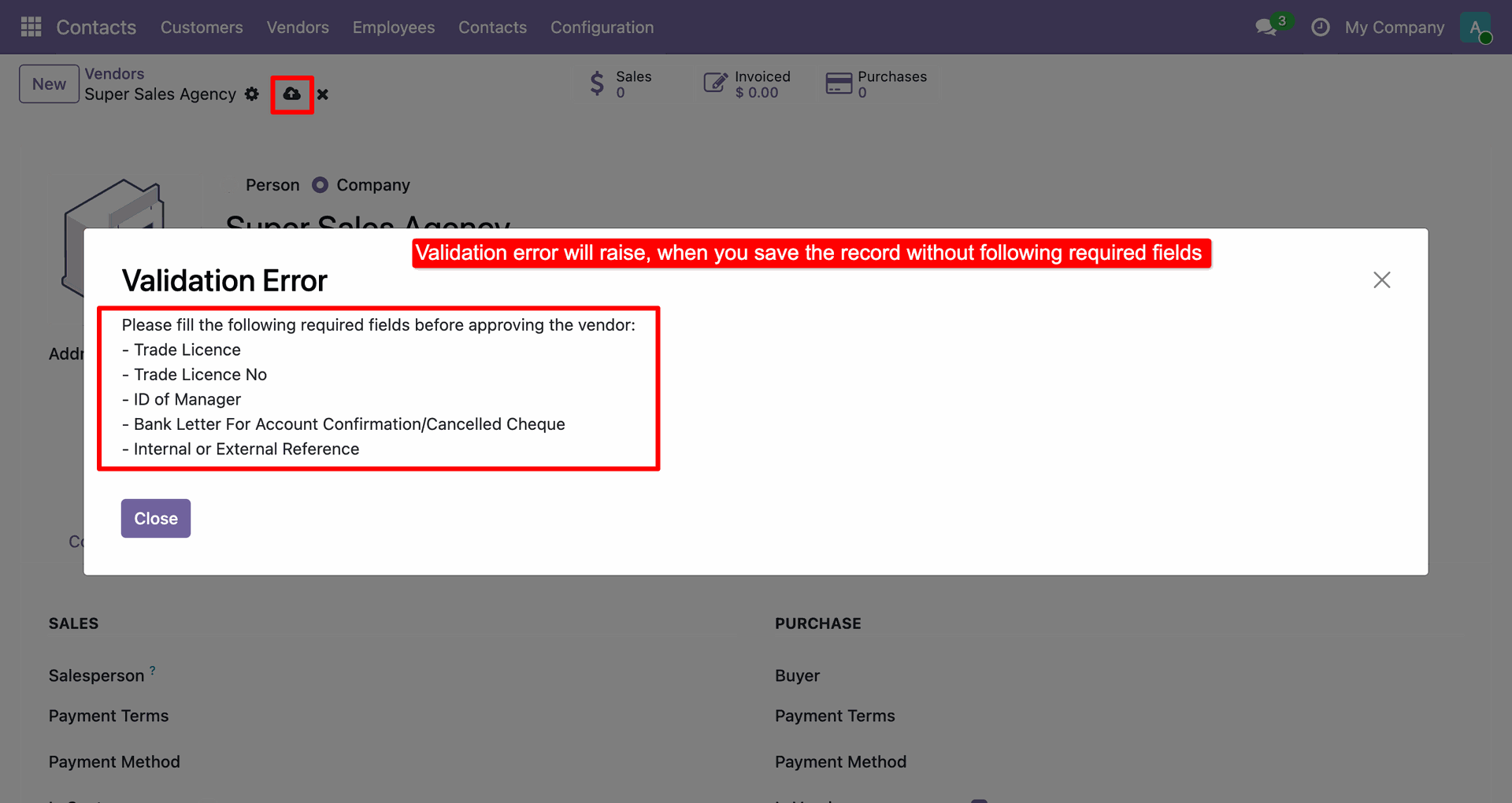 A validation pop-up prevents saving the record if mandatory fields like Trade Licence or ID of Manager are missing.