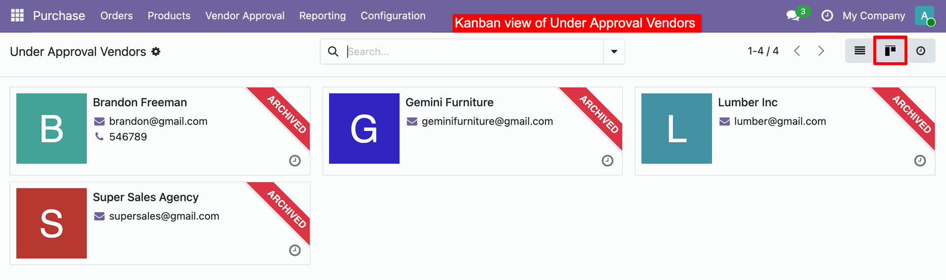 The Kanban view displays pending vendors with an 'Archived' ribbon to visually confirm their inactive status.