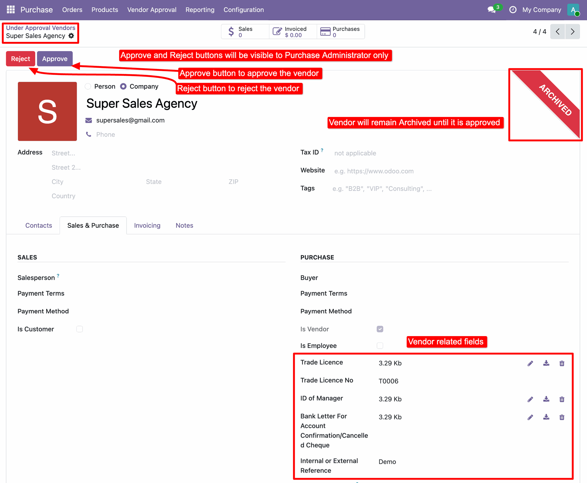 The detailed form view, where Purchase Administrators review submitted documents and use the Approve or Reject buttons to finalize the vendor's status.