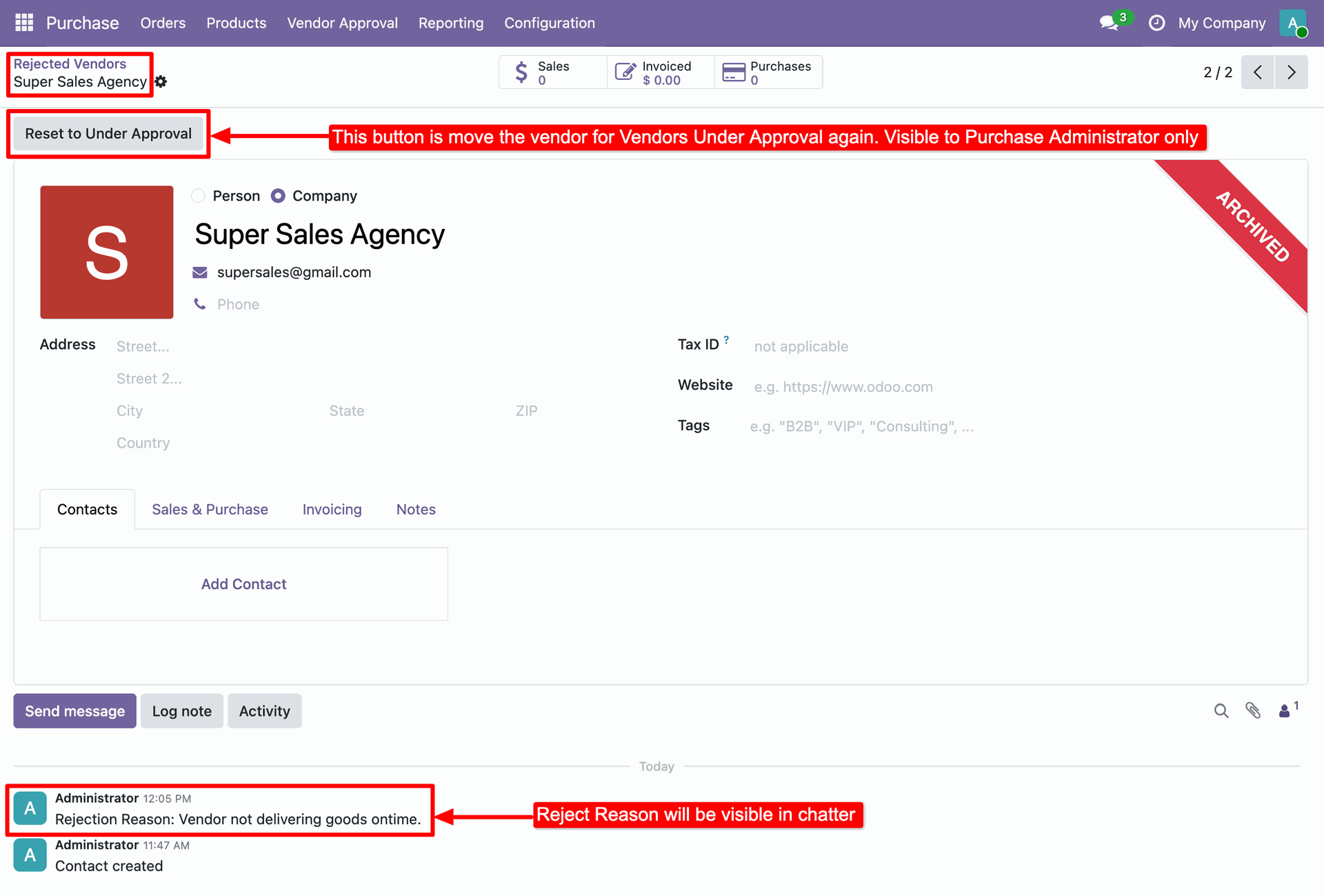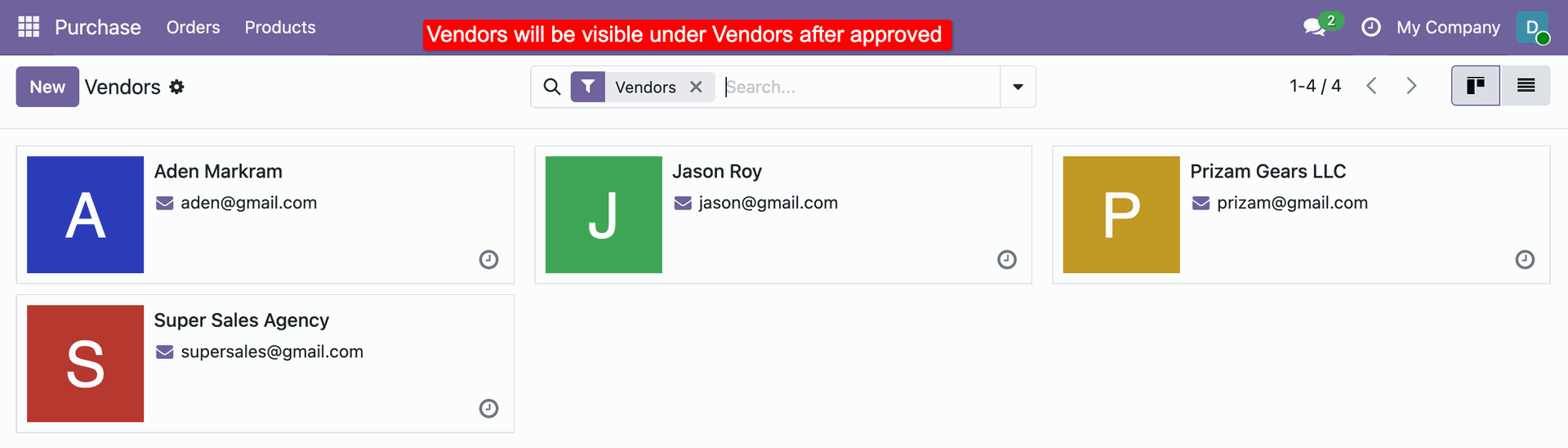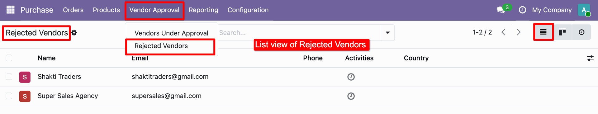 A dedicated list view under the Vendor Approval menu displays all the rejected vendors for easy tracking and management.