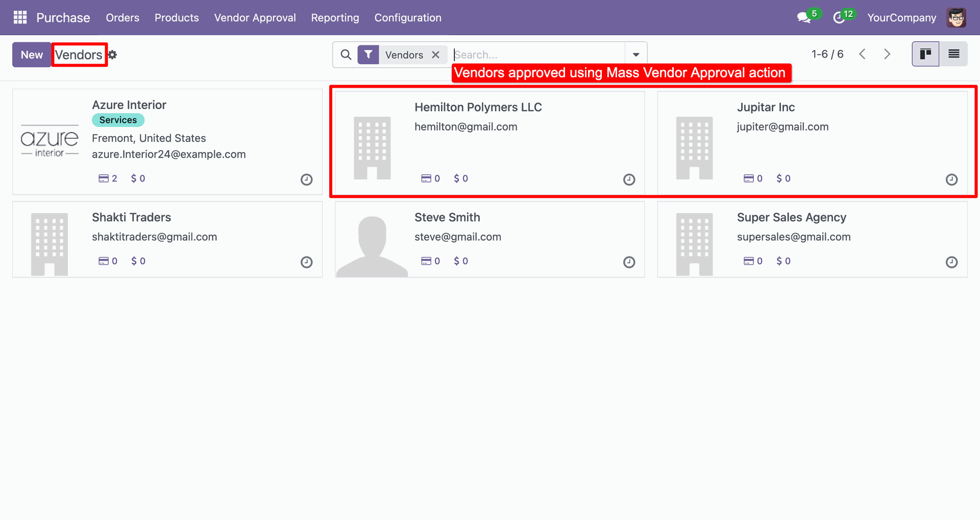 Select multiple pending vendors and choose Mass Vendor Approval from the Actions menu to validate them all at once.