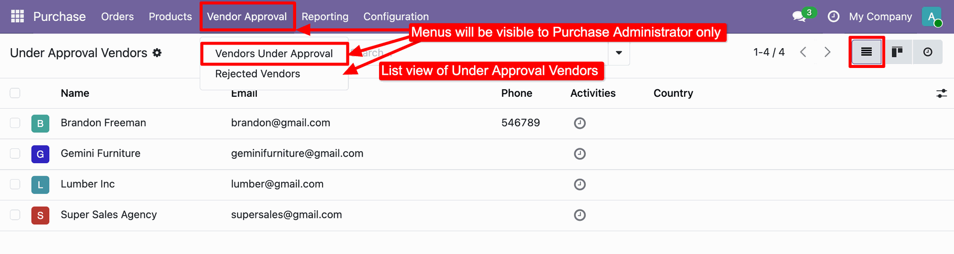 A dedicated list view under the Vendor Approval menu displays all the rejected vendors for easy tracking and management.