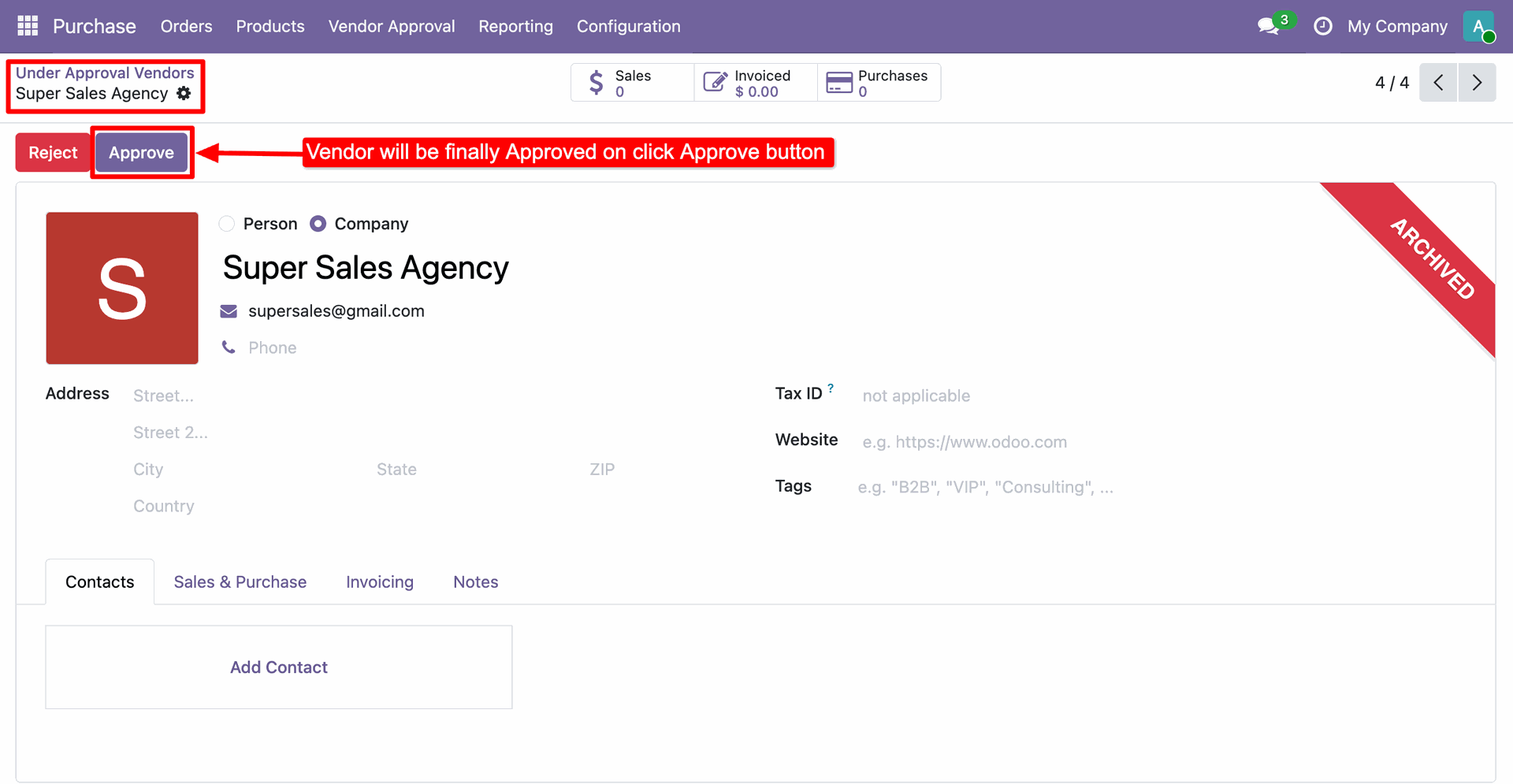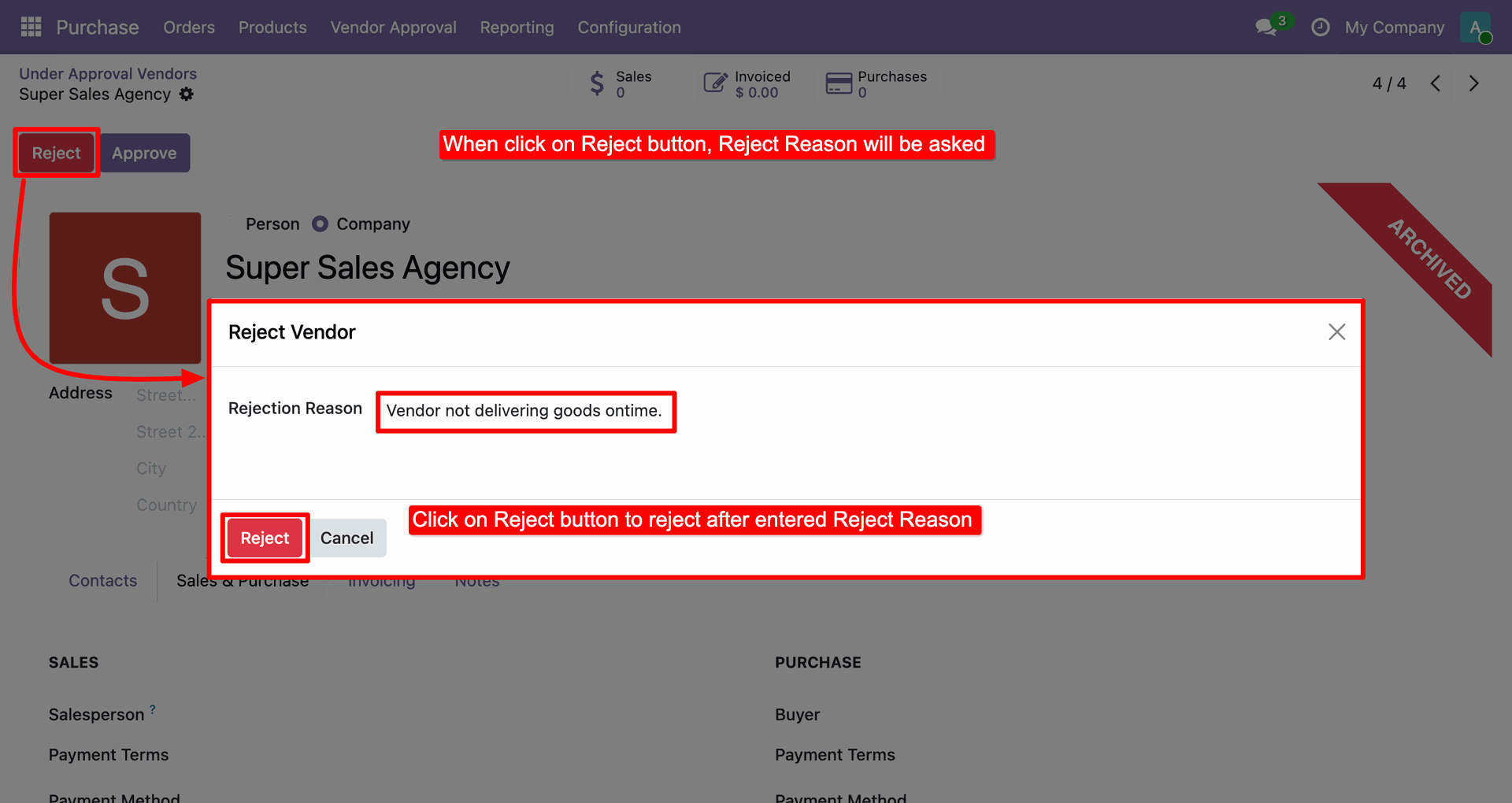 The detailed form view, where Purchase Administrators review submitted documents and use the Approve or Reject buttons to finalize the vendor's status.
