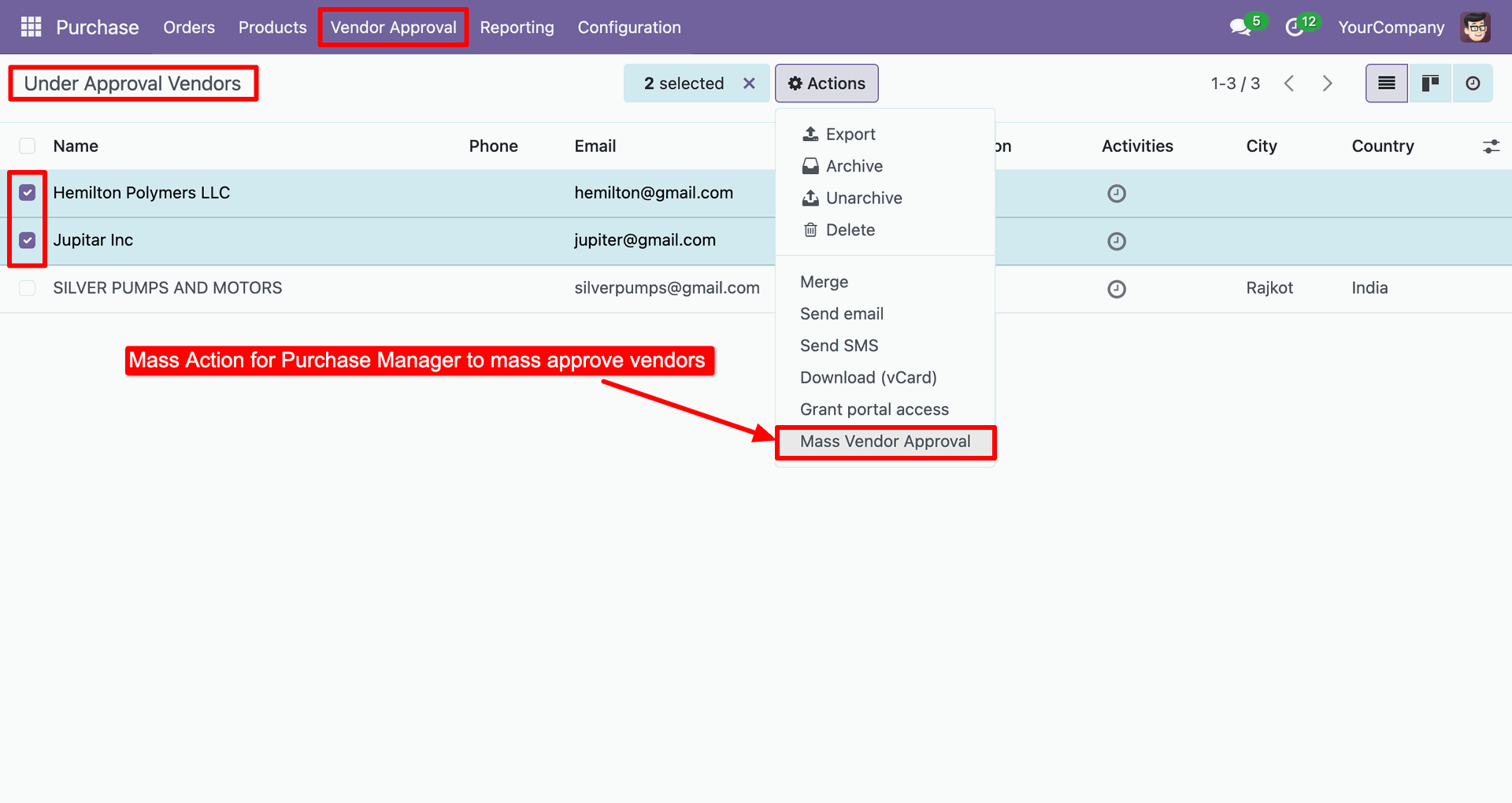 Select multiple pending vendors and choose Mass Vendor Approval from the Actions menu to validate them all at once.