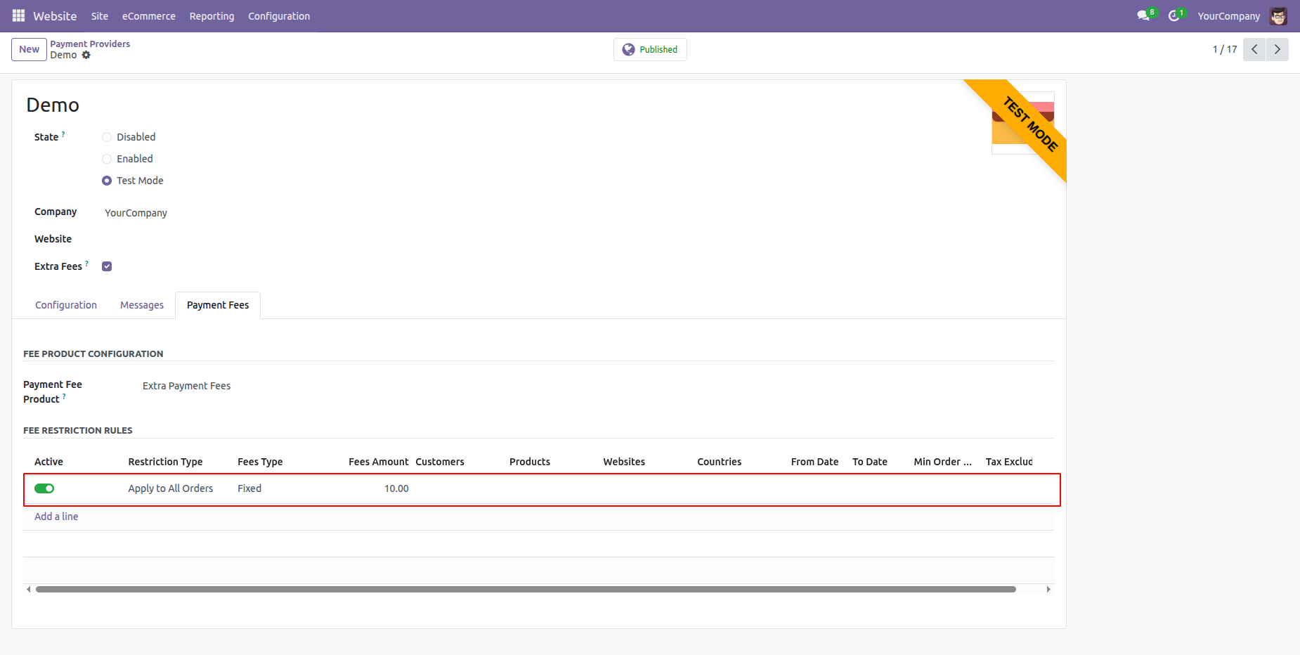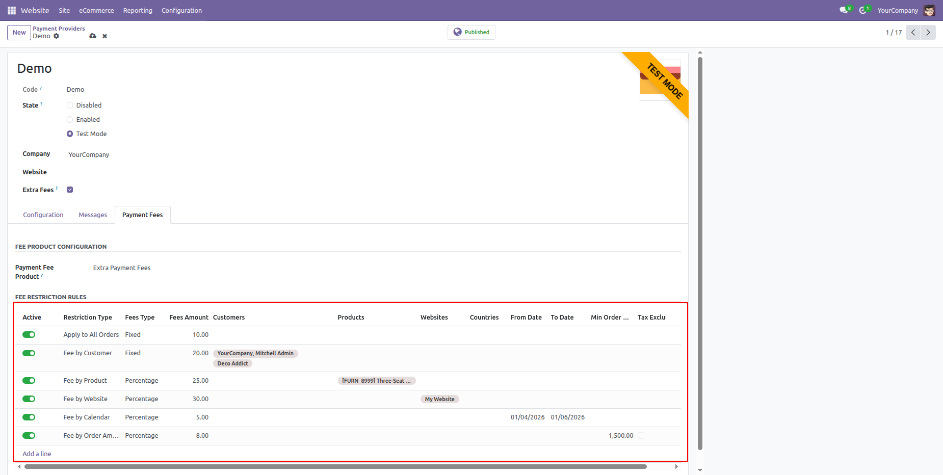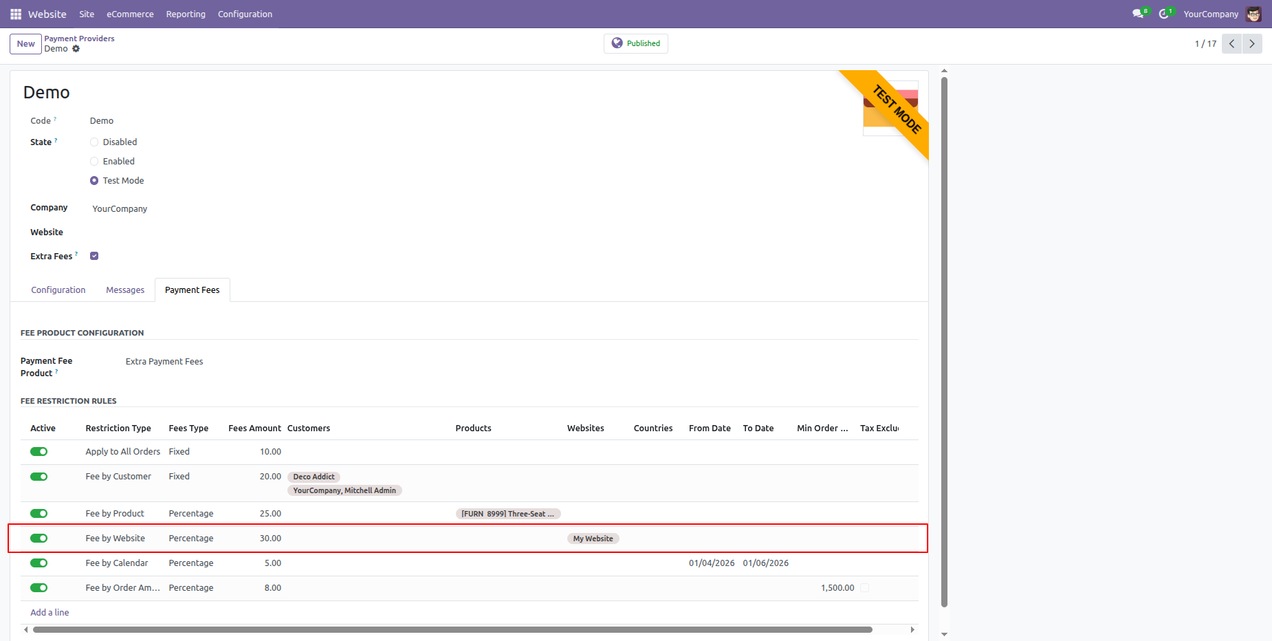 Here, you can see that the website-based extra fees are not automatically applied because a different website (My Website) is selected.