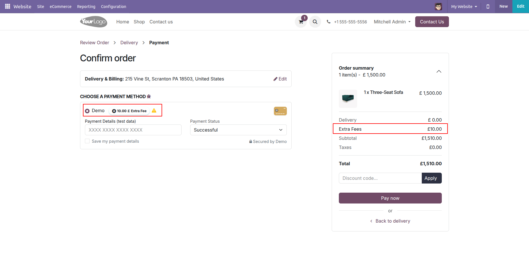 Here, you can see the country-based extra fees are automatically applied.