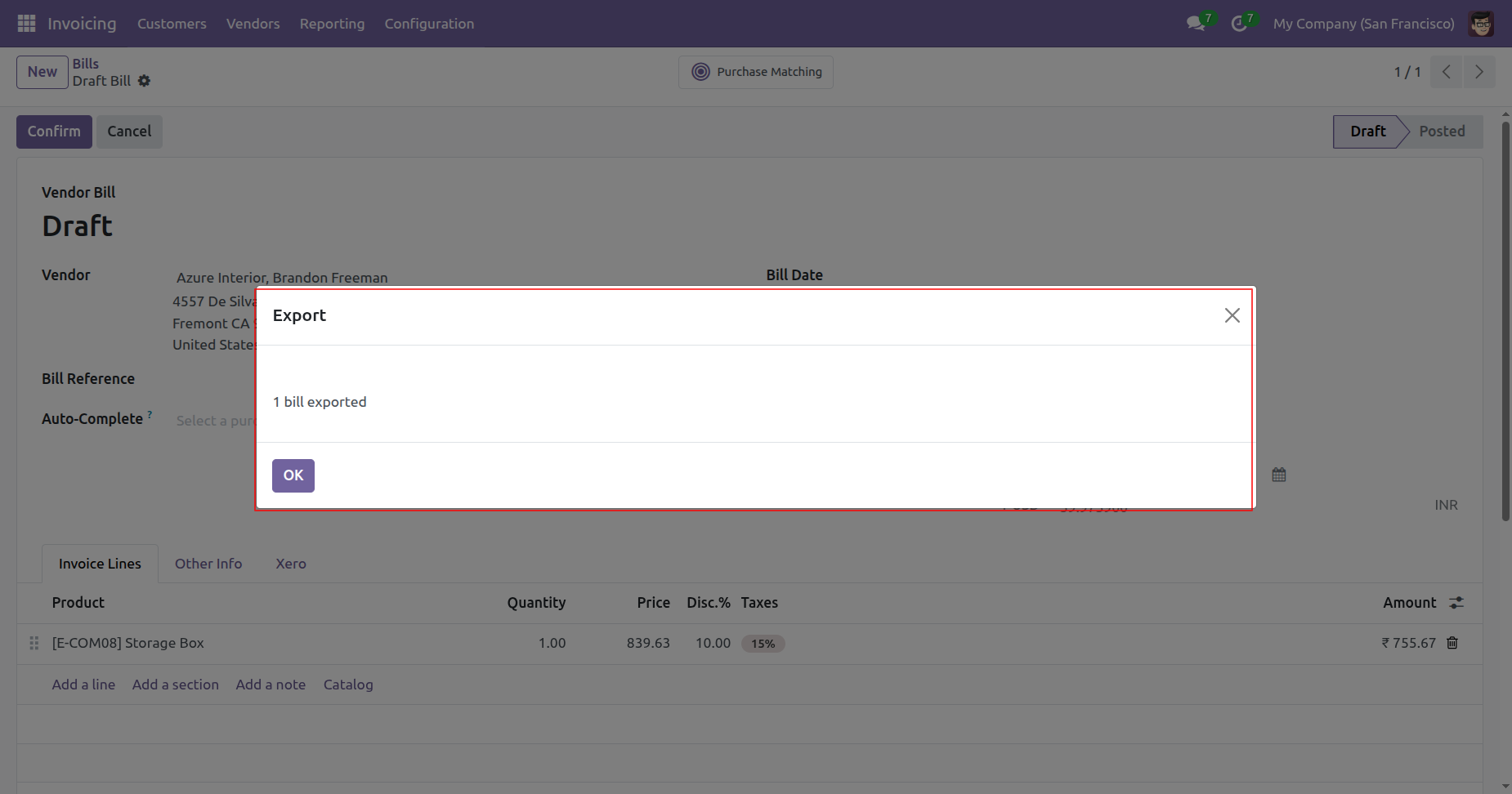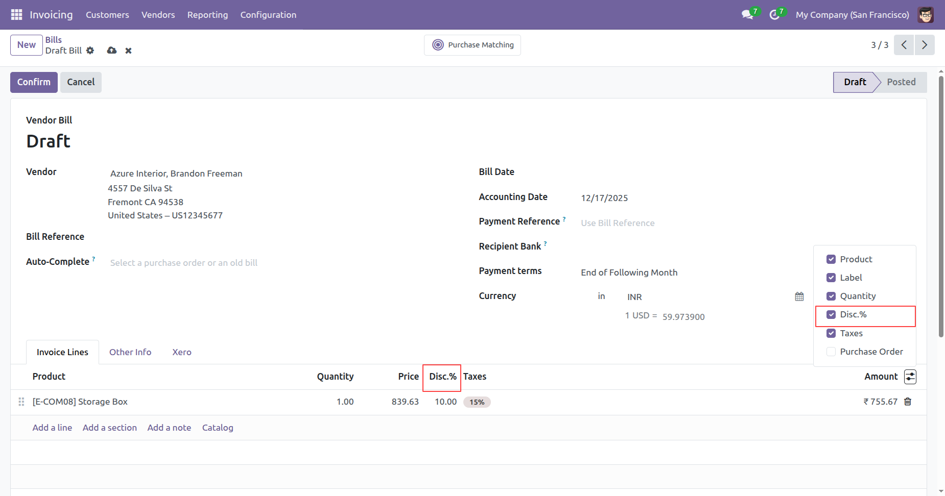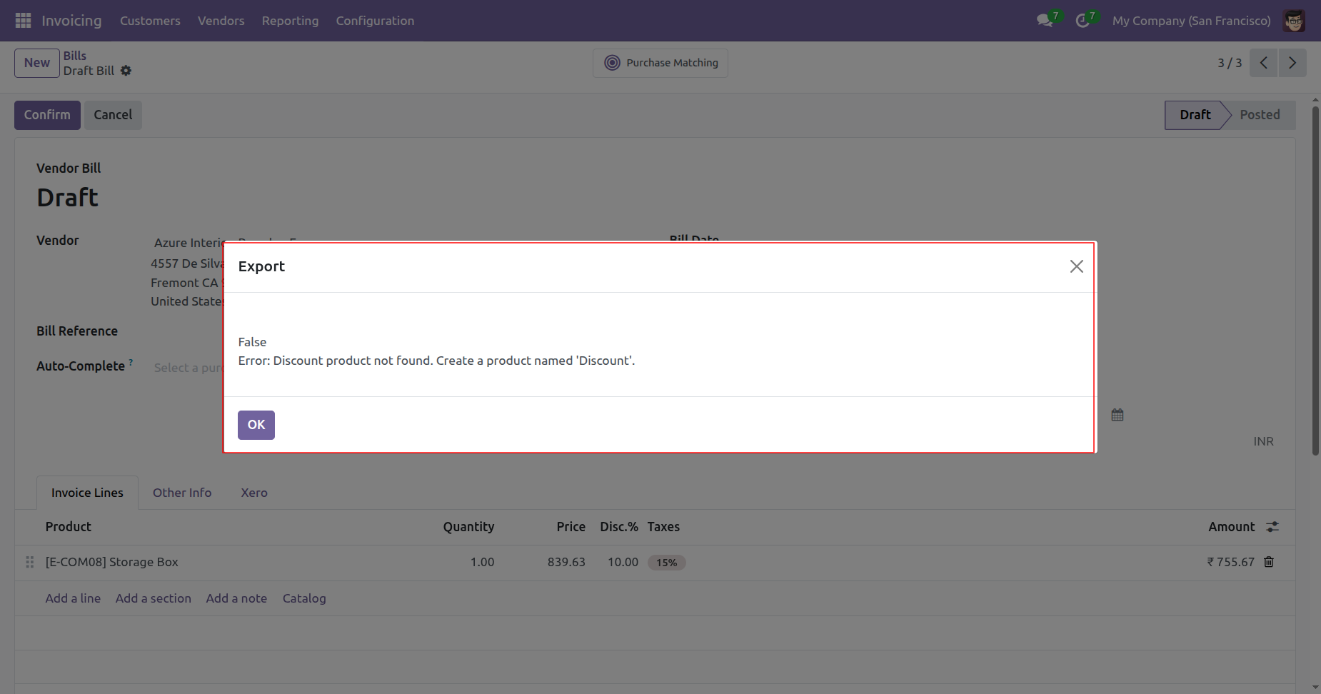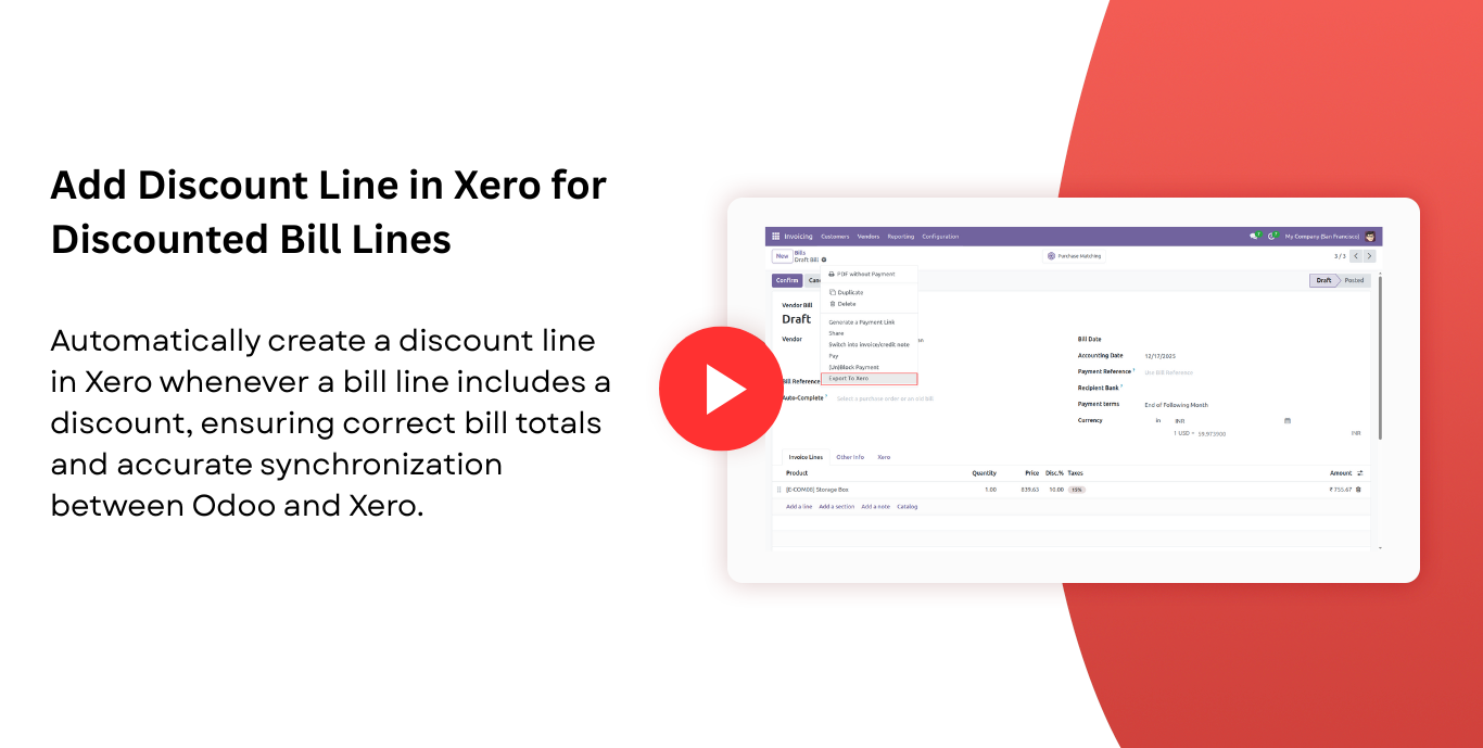 When a bill line in Odoo includes a discount, the connector creates a corresponding discount line in Xero during sync.