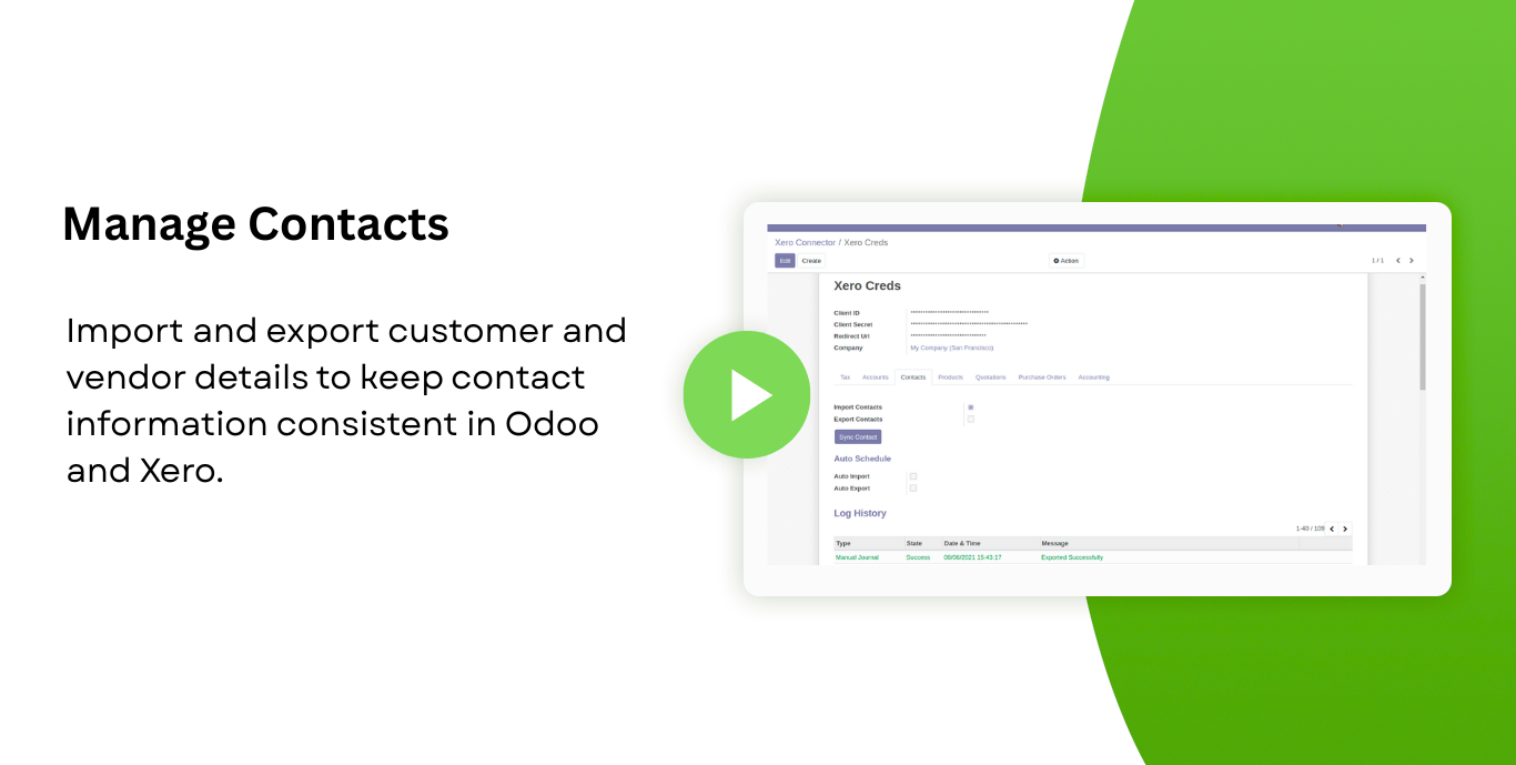 The Xero Connector module integrates Odoo with Xero using OAuth2 authentication, allowing a secure connection and synchronization of key financial data between systems. You can import or export contacts, chart of accounts, products, orders, invoices, bills, credit notes, refunds, payments, taxes, and attachments. The module supports scheduled sync jobs with logs for success or failure details.